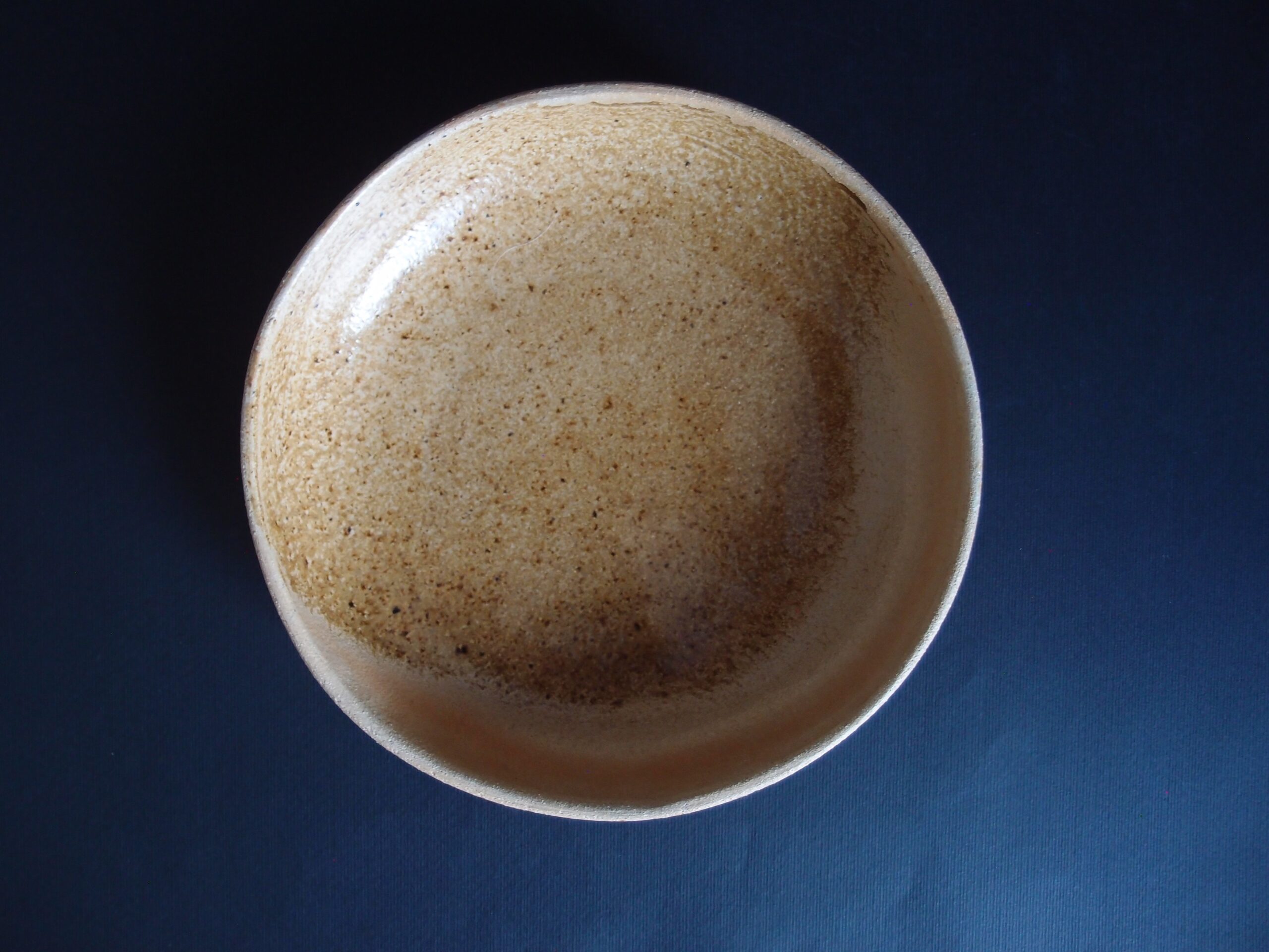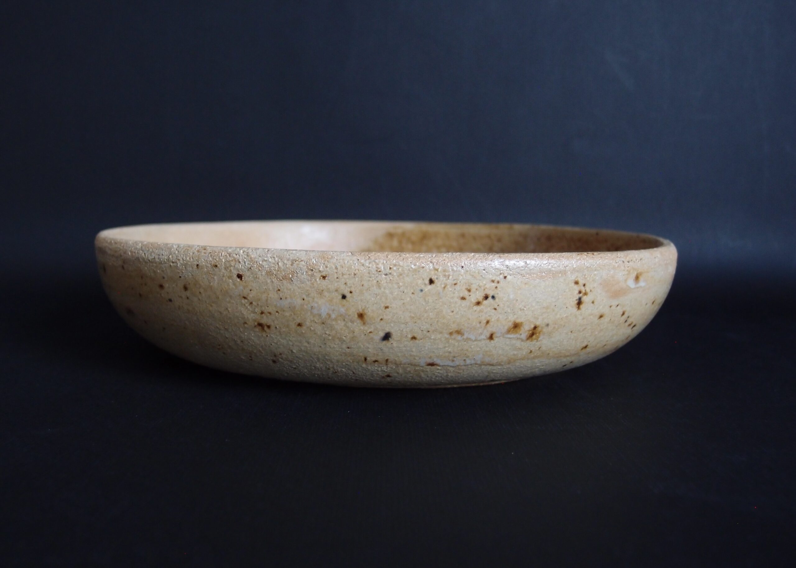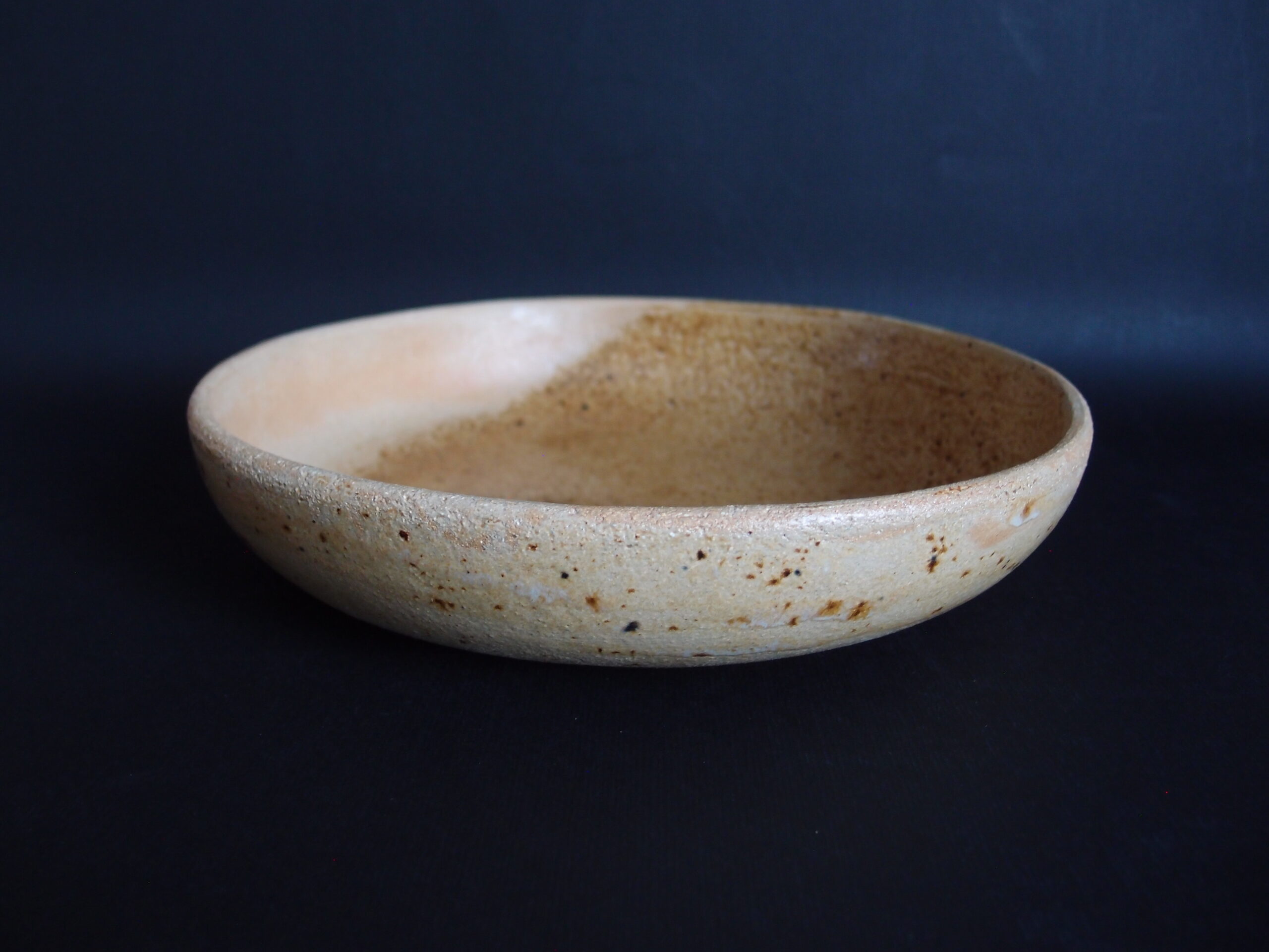 Miska wykonana z jasnej gliny, pokryta z zewnątrz matowym, beżowym szkliwem. W środku złoto-żółtym, błyszczącym szkliwem z efektami. Idealna na owoce, do podawania sałatek lub pierogów.