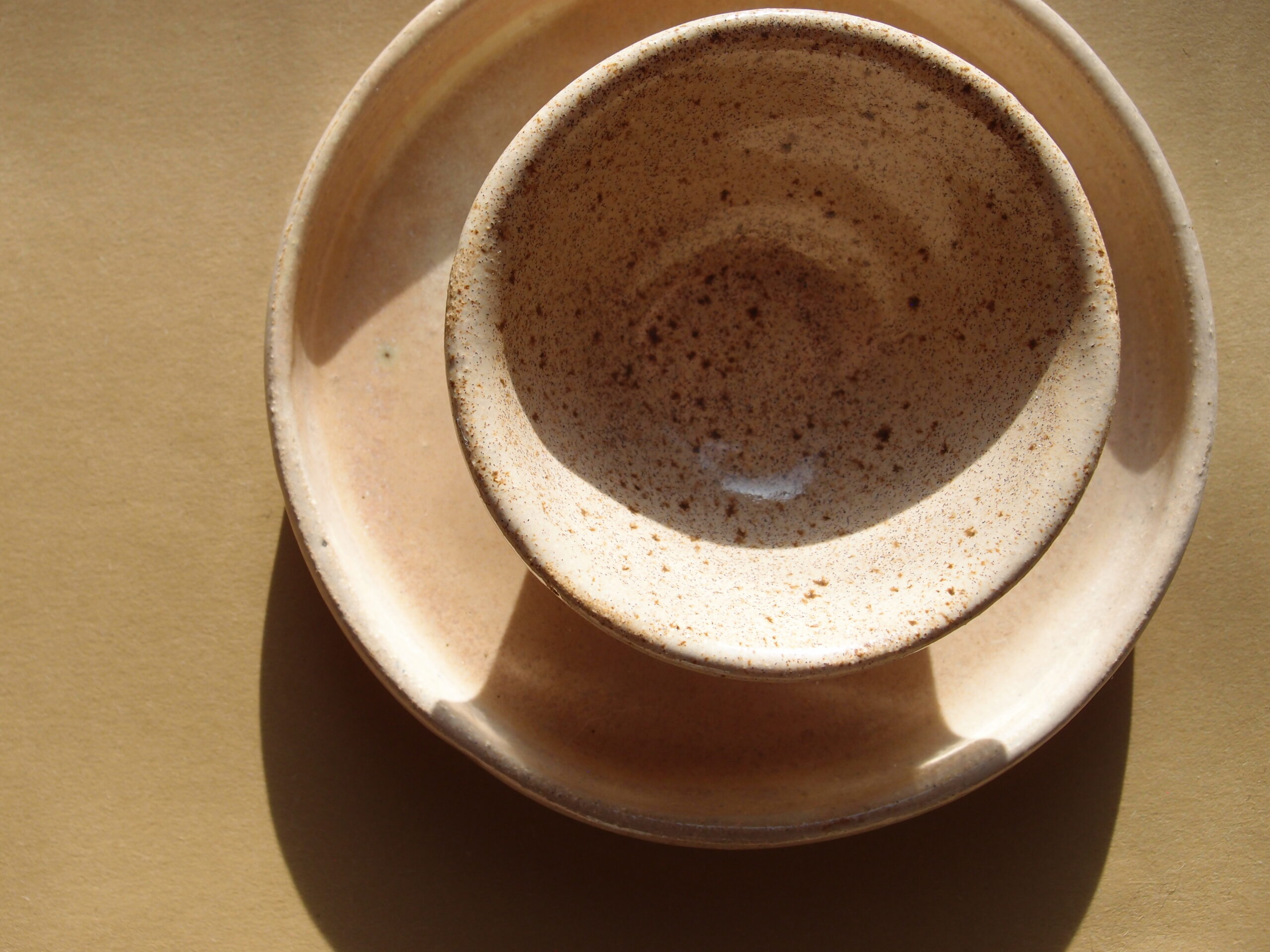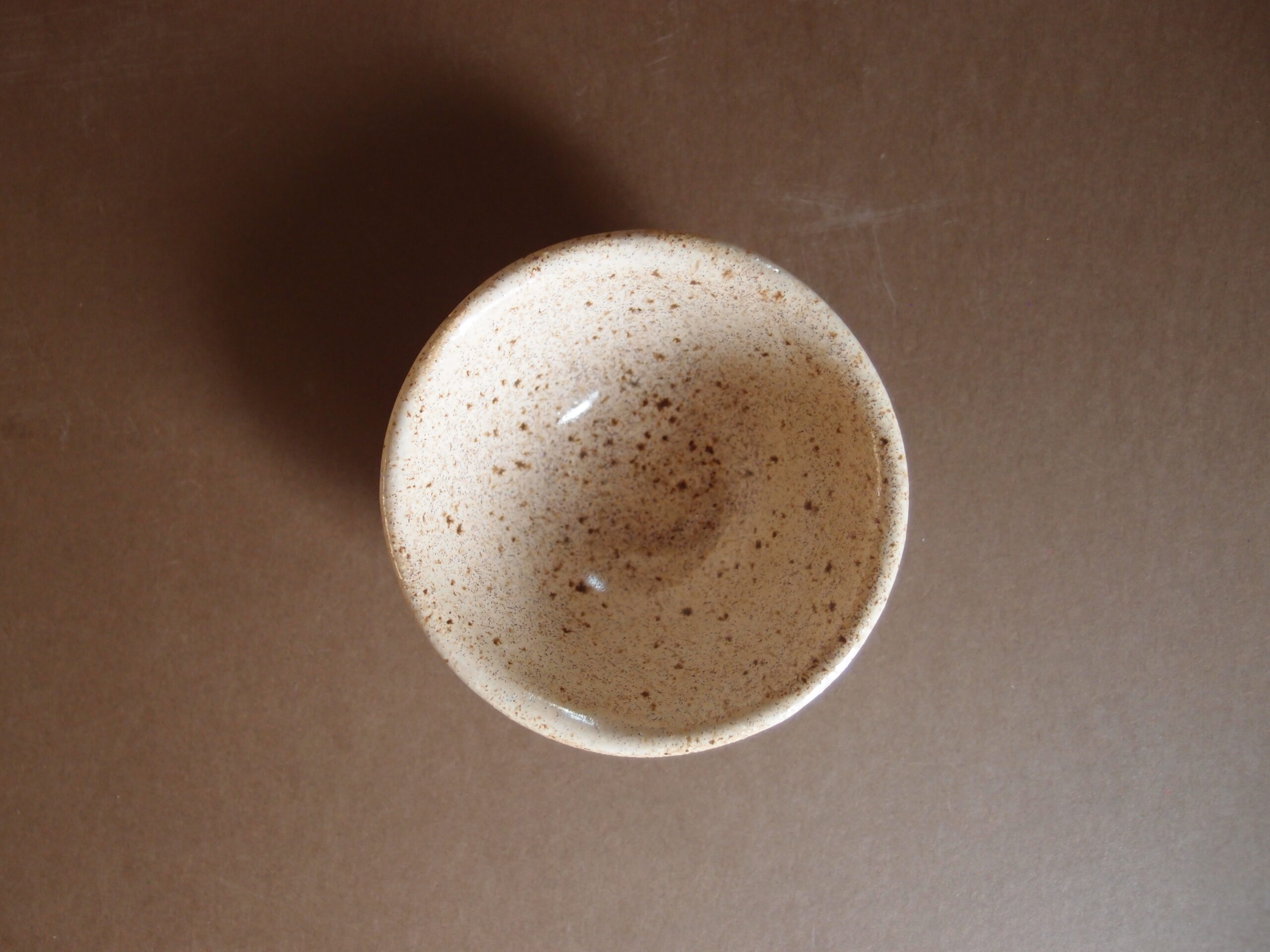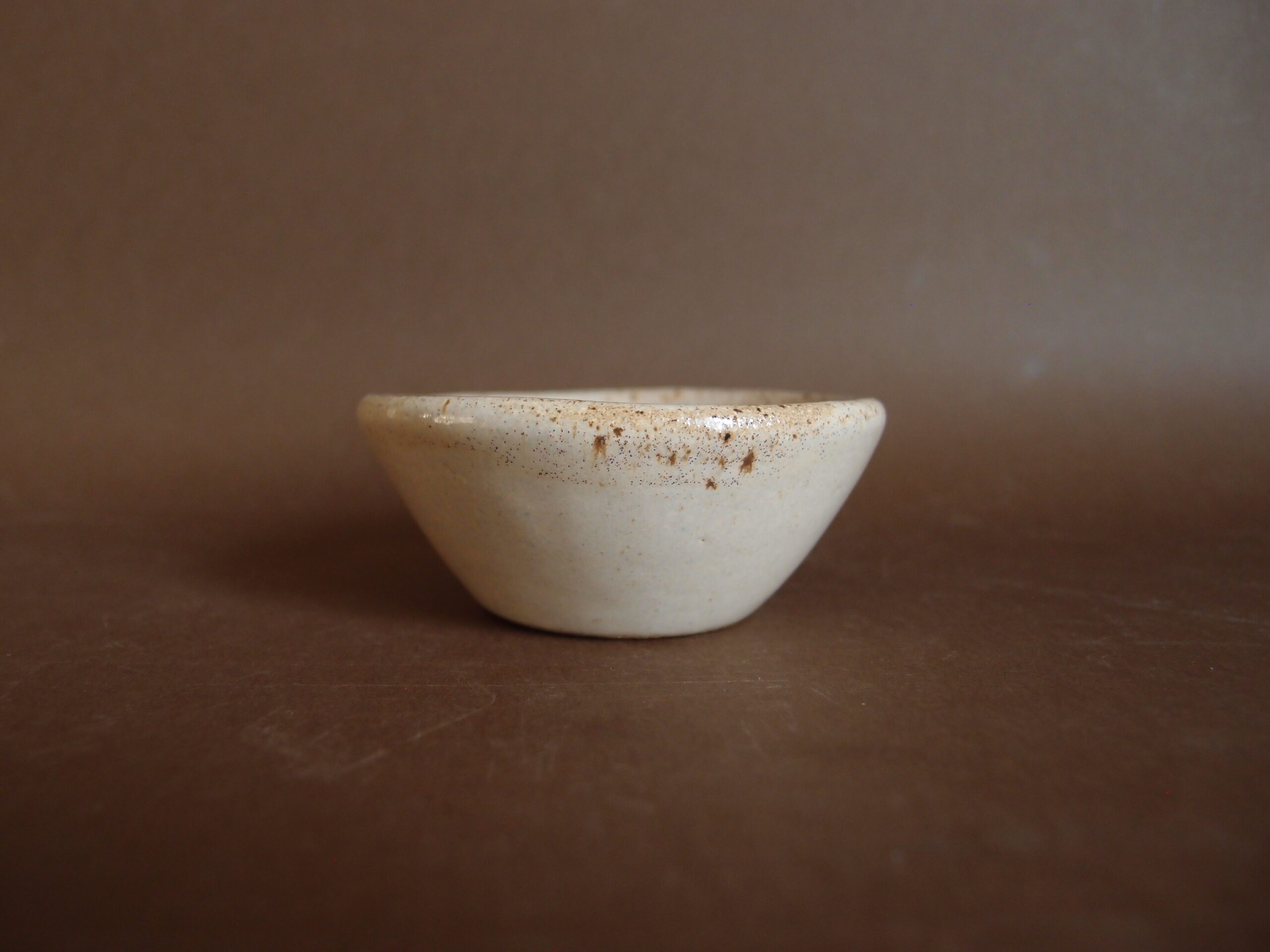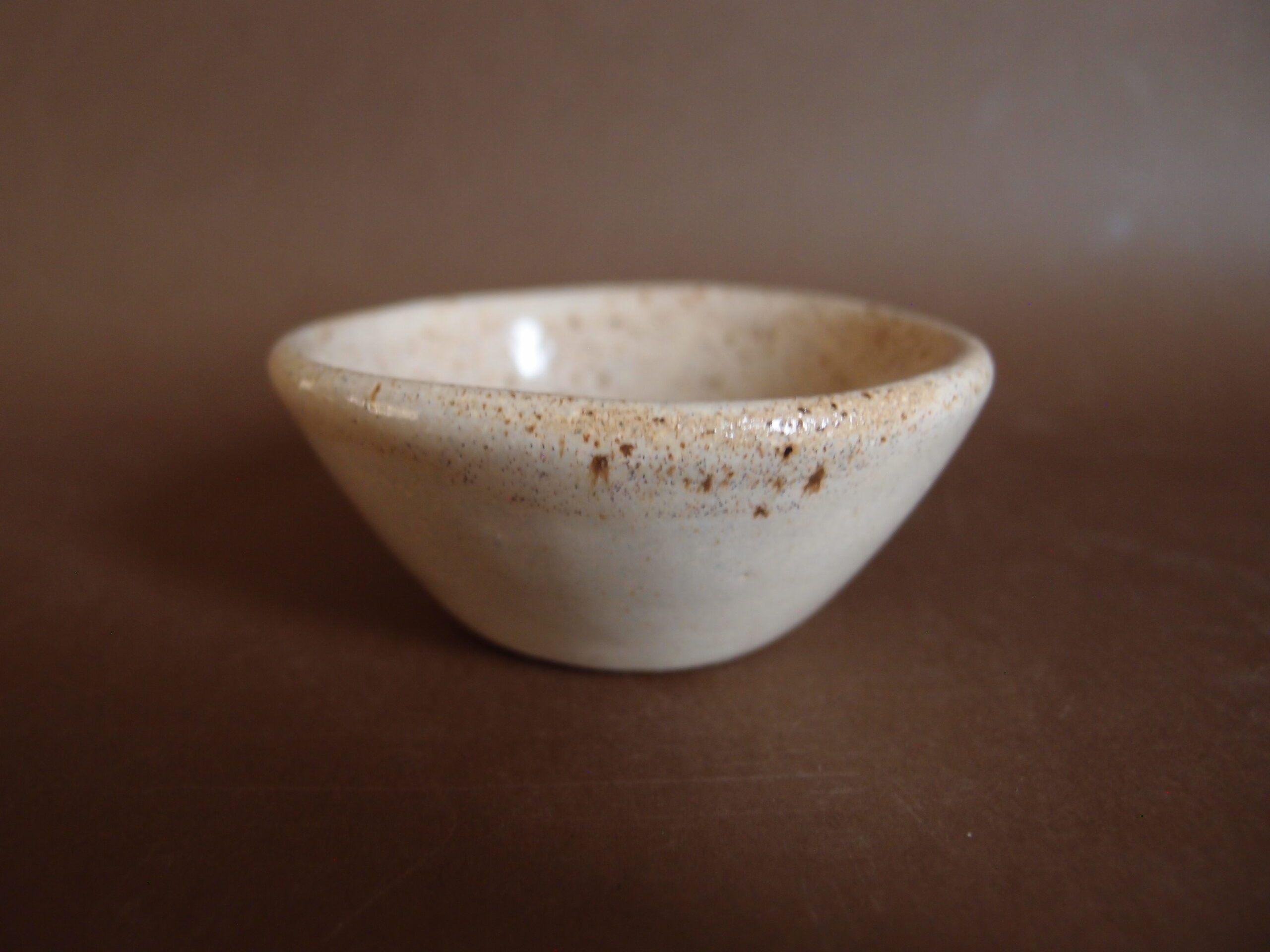 Miseczka wykonana z jasnej gliny, pokryta kremowym, błyszczącym szkliwem z efektami nakrapiania. Świetnie nadaje się do podawania dodatków do dań, soli, ziarenek.