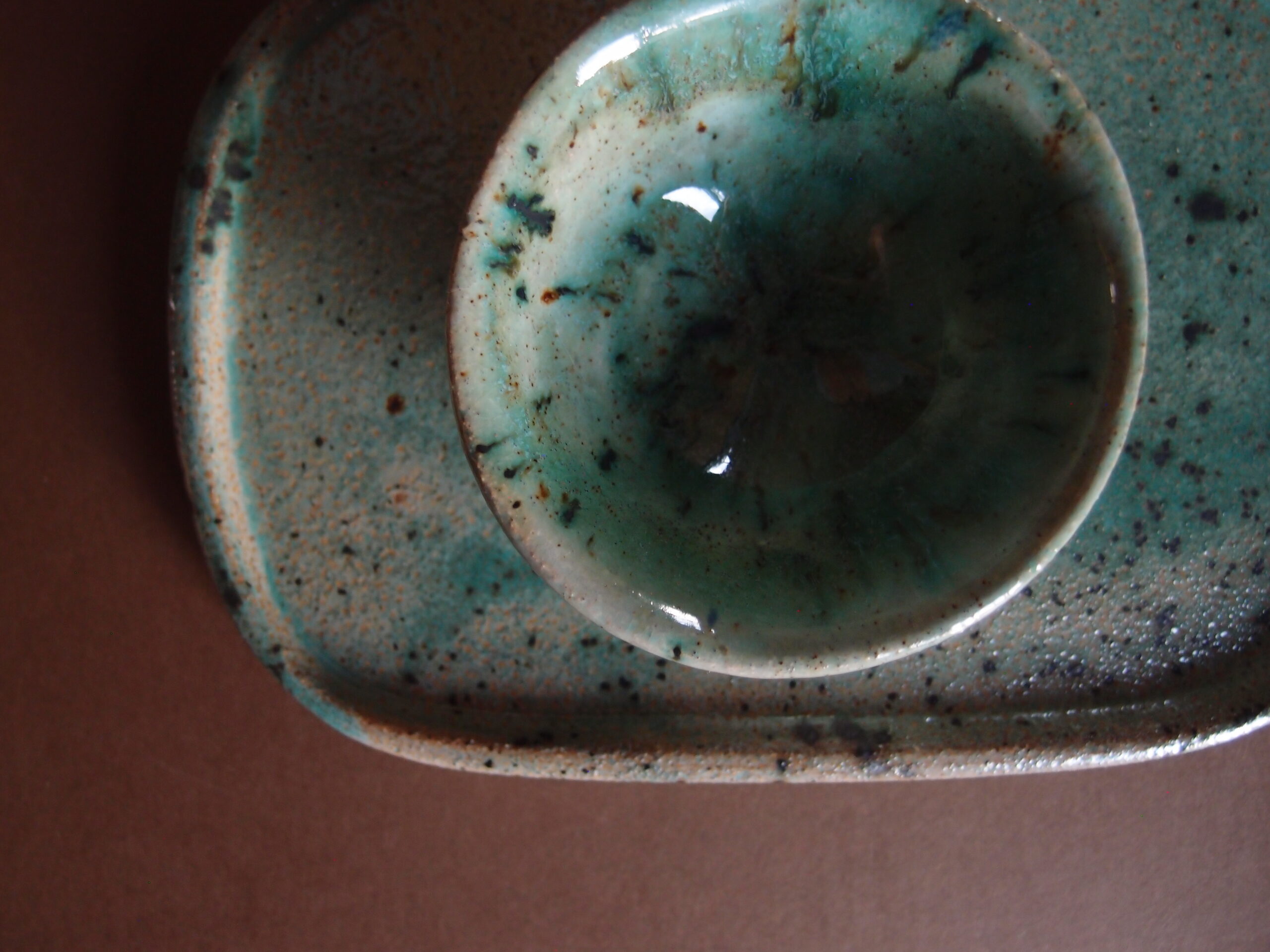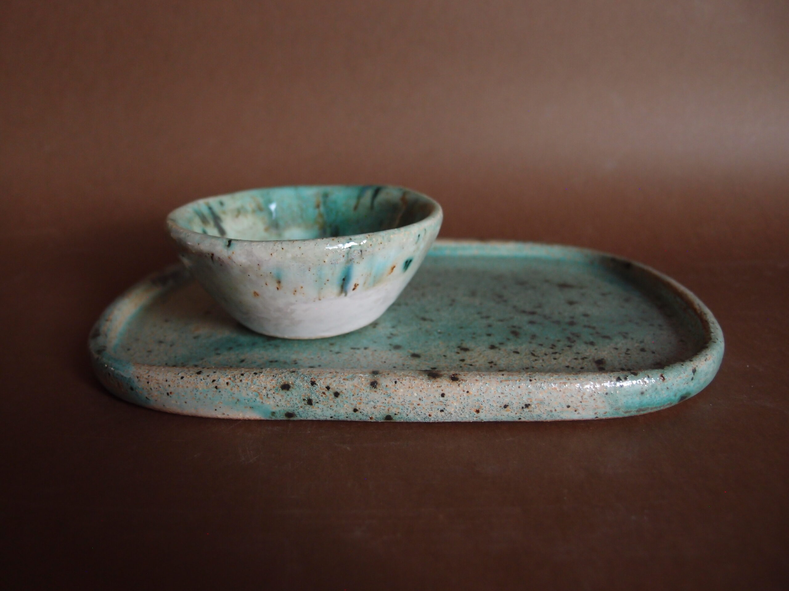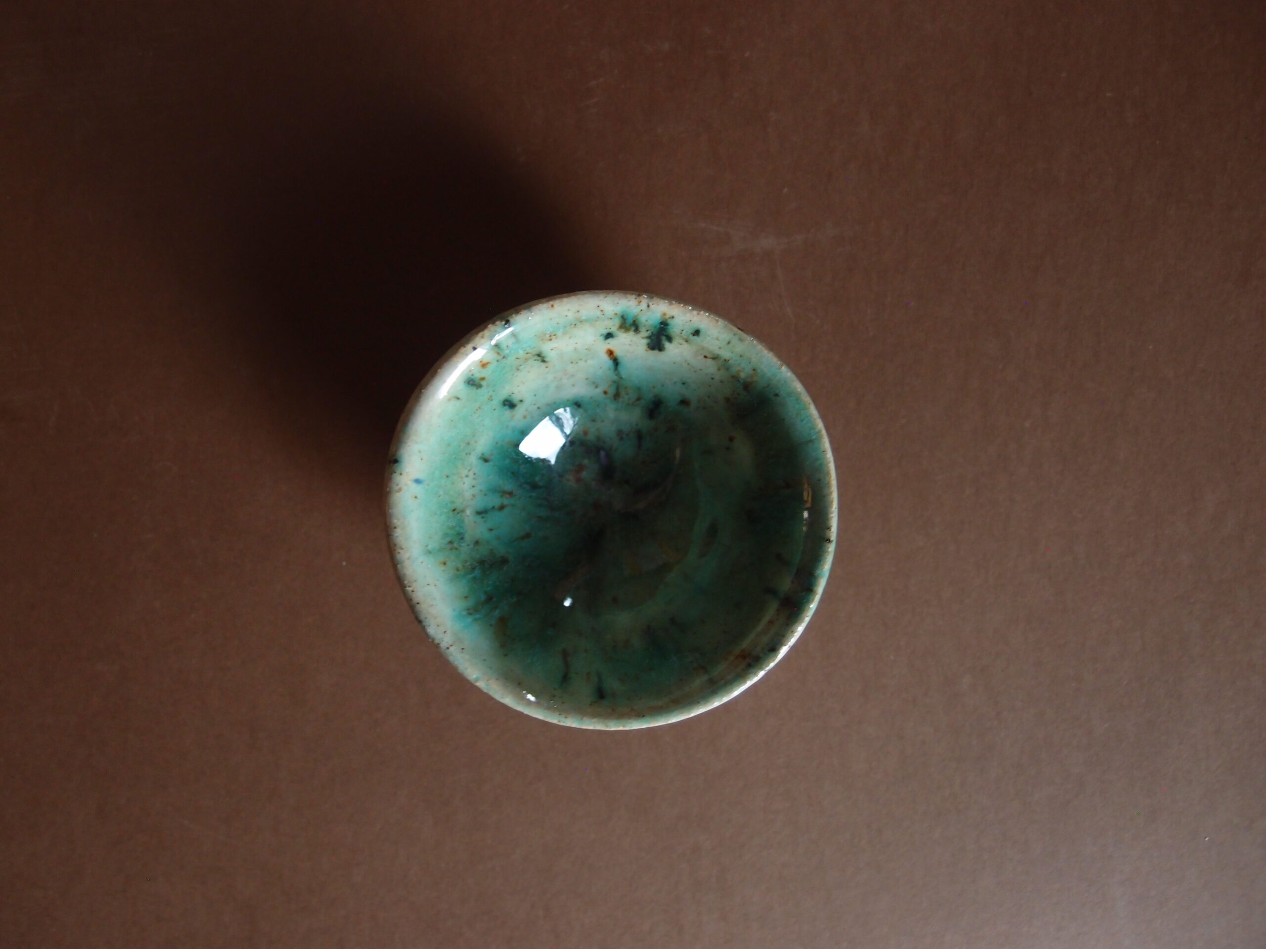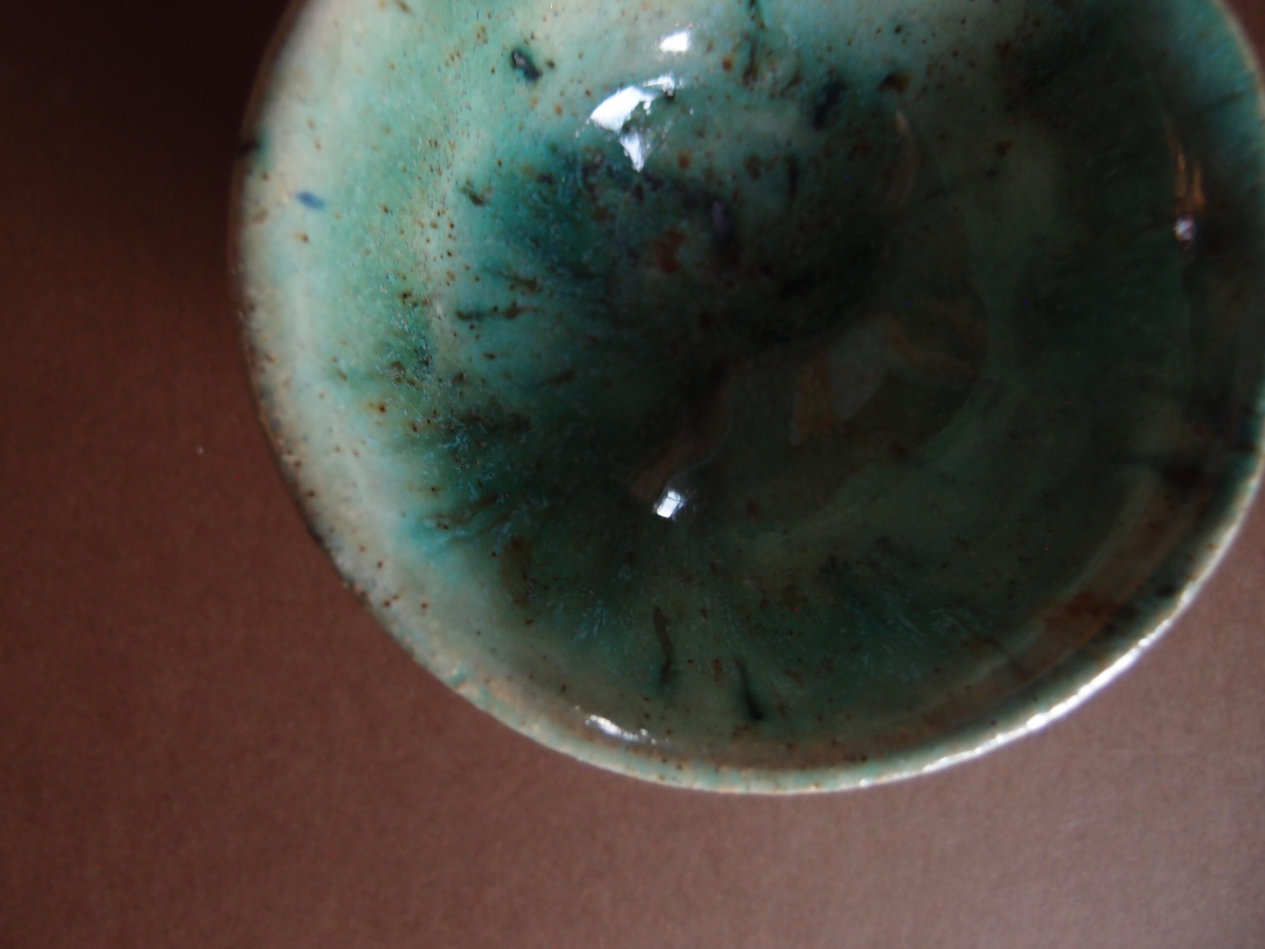 Miseczka wykonana z jasnej gliny, w środku pokryta, turkusowym, błyszczącym szkliwem z efektami, z zewnątrz jaśniejszym.