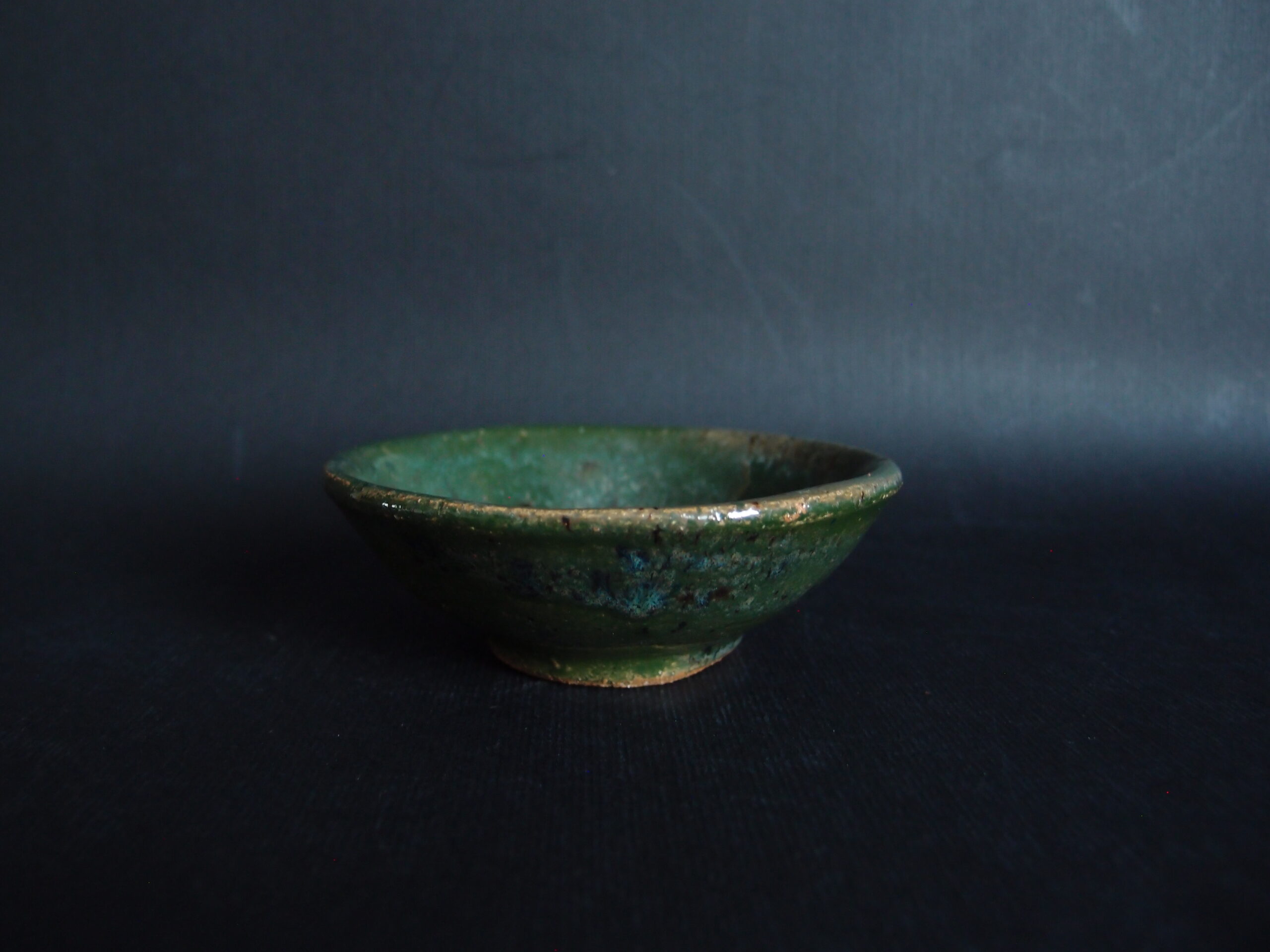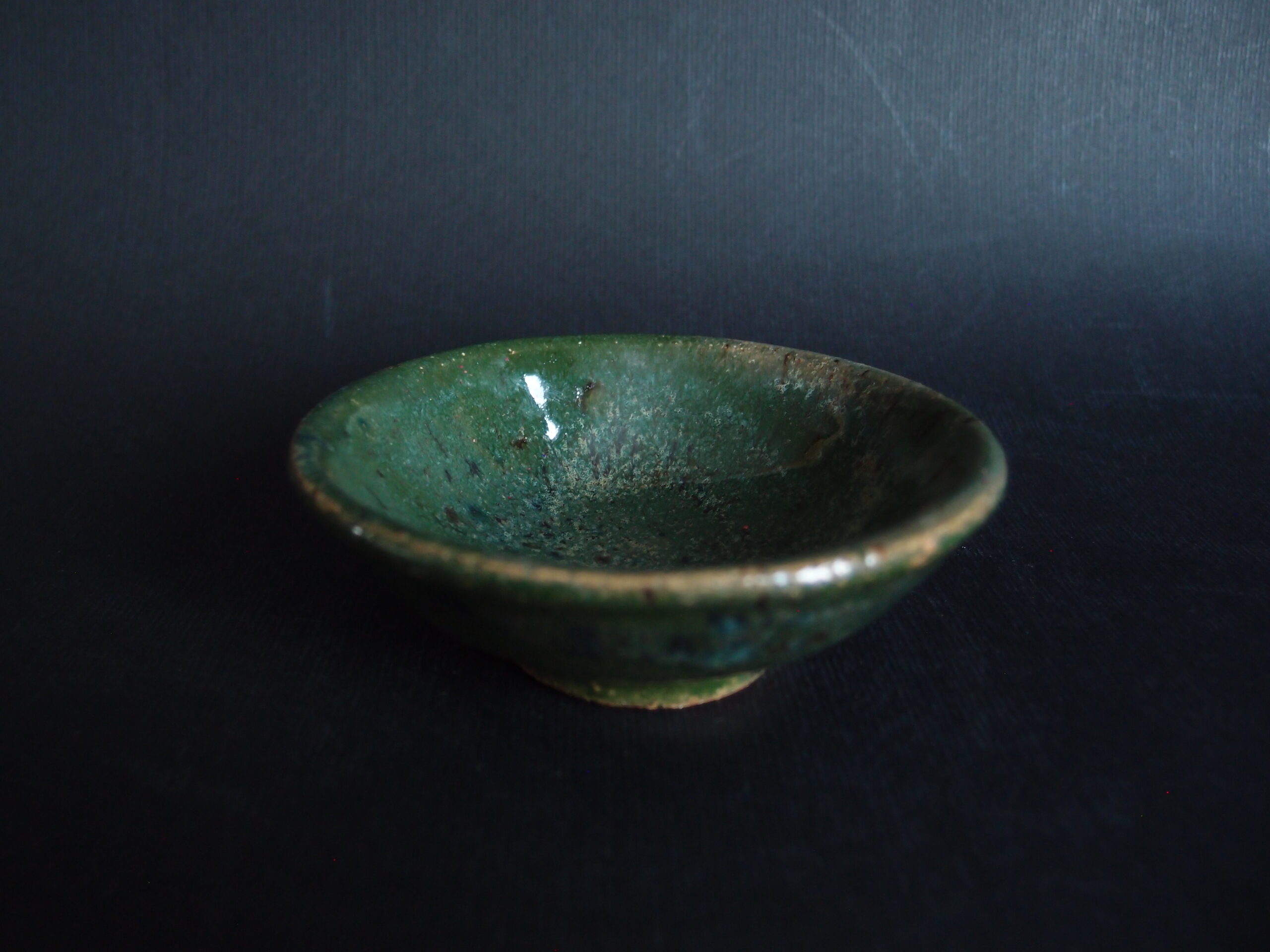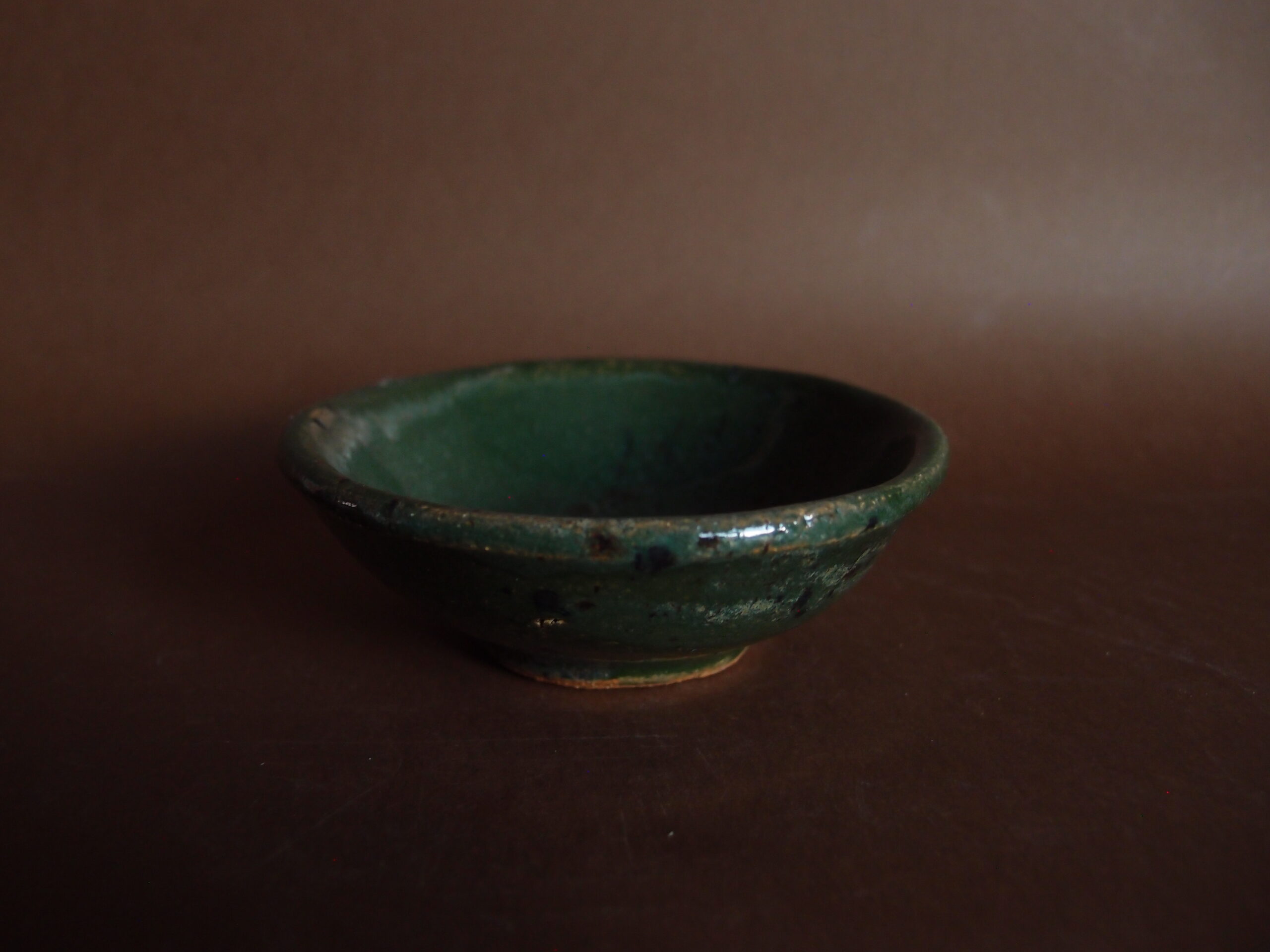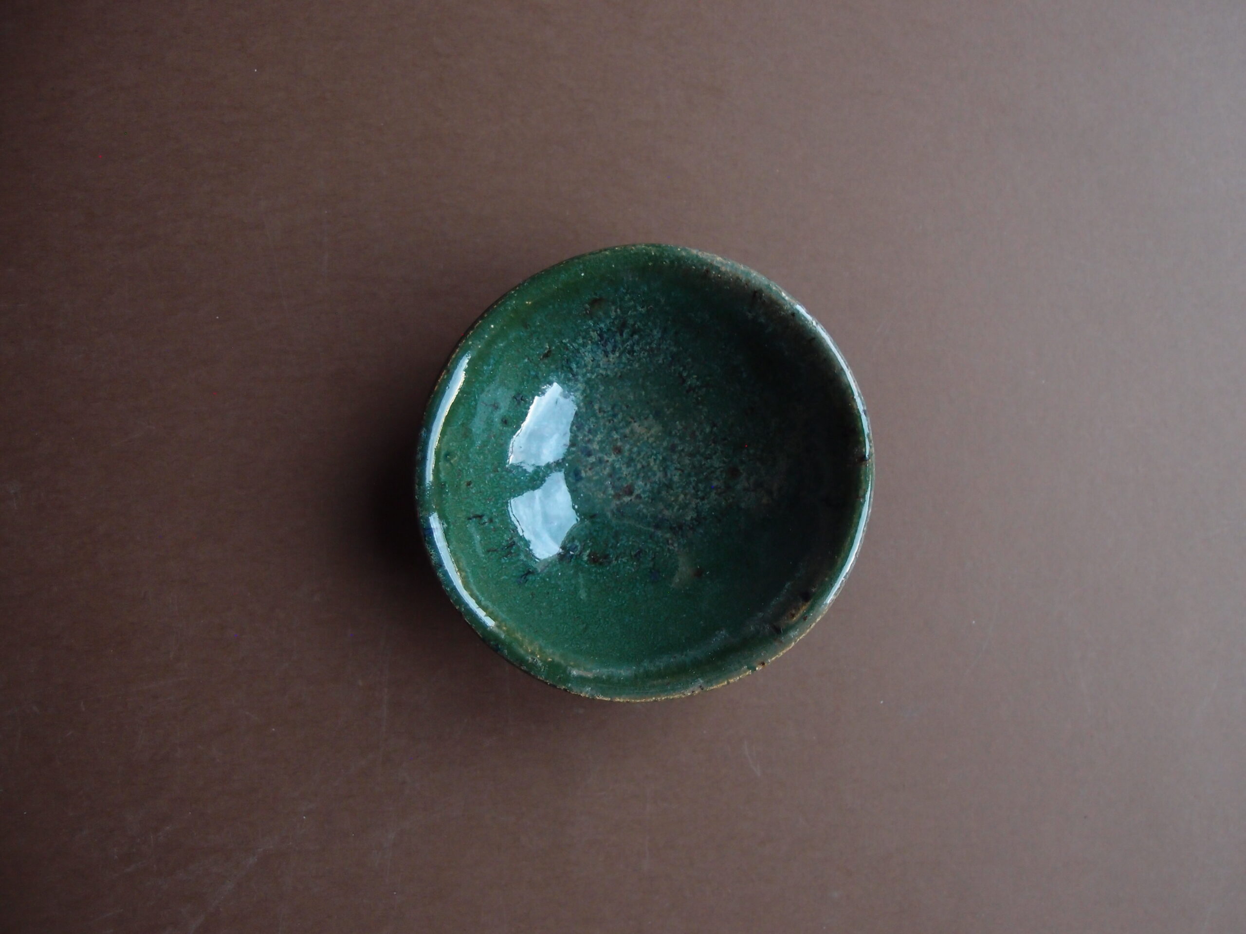 Miseczka wykonana z jasnej gliny, pokryta zielony, błyszczącym szkliwem z efektami.