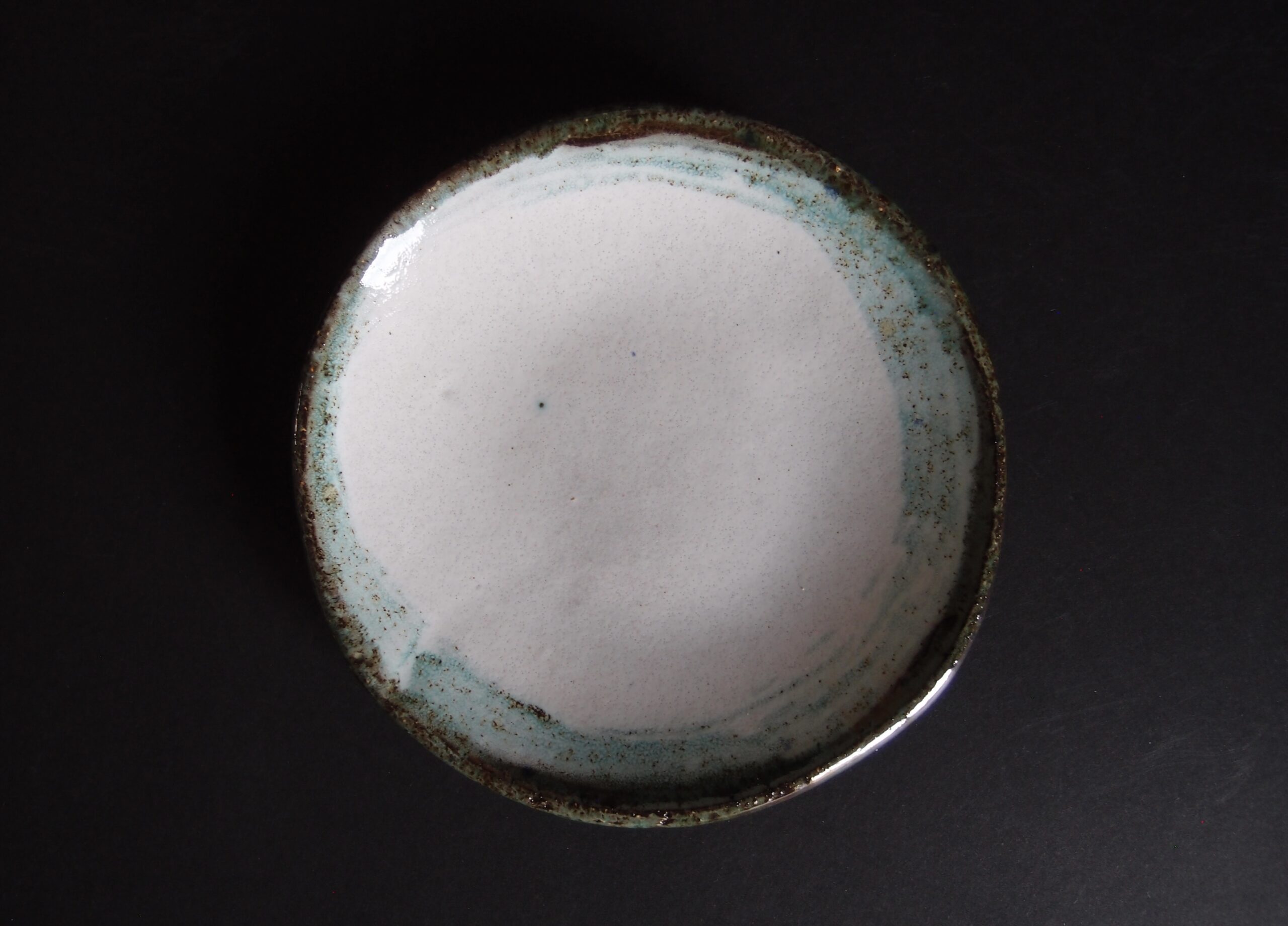 Miseczka wykonana z ciemnej gliny, pokryta białym, półmatowym szkliwem z błyszczącym, zielono-brązowym brzegiem.