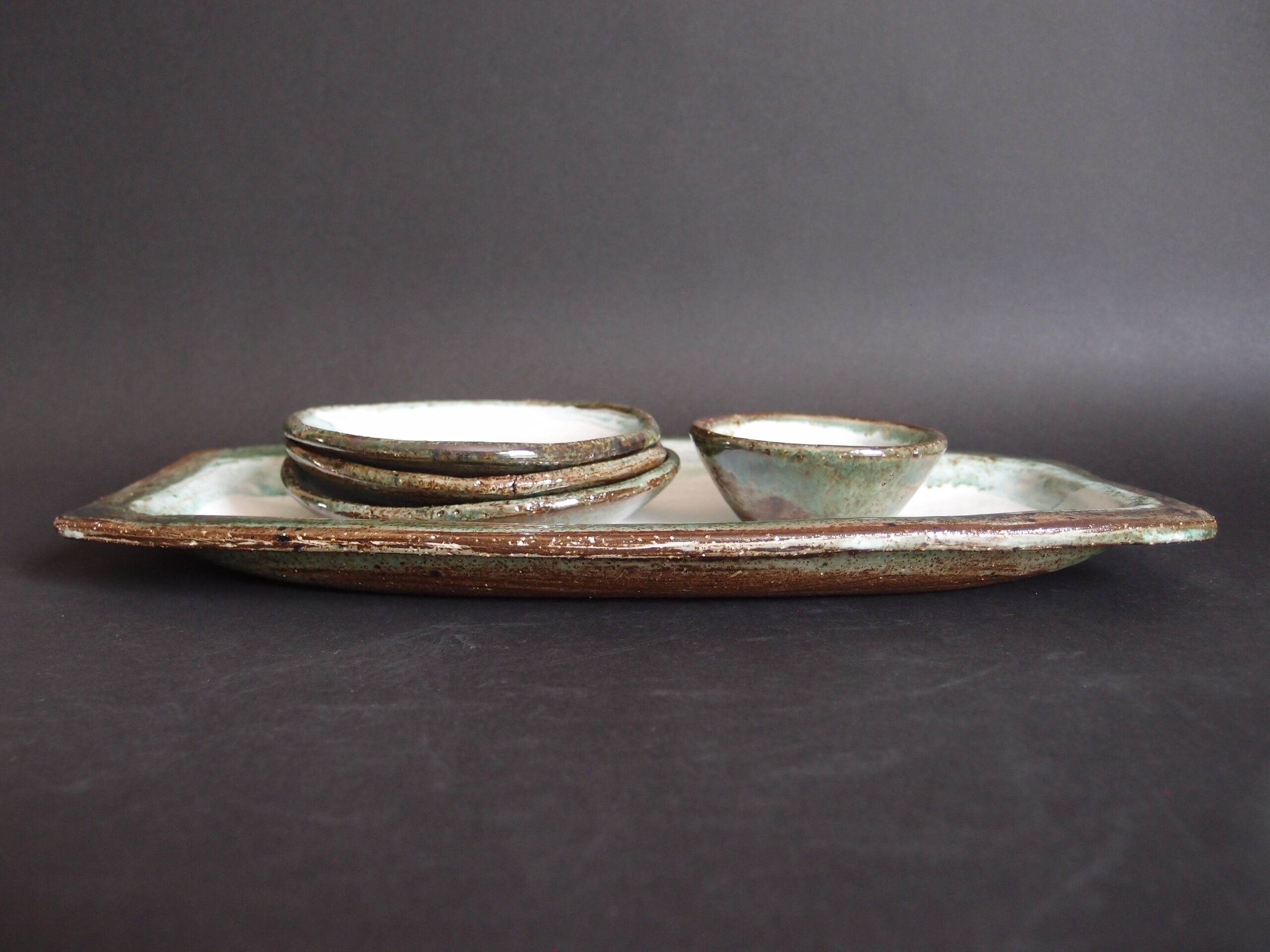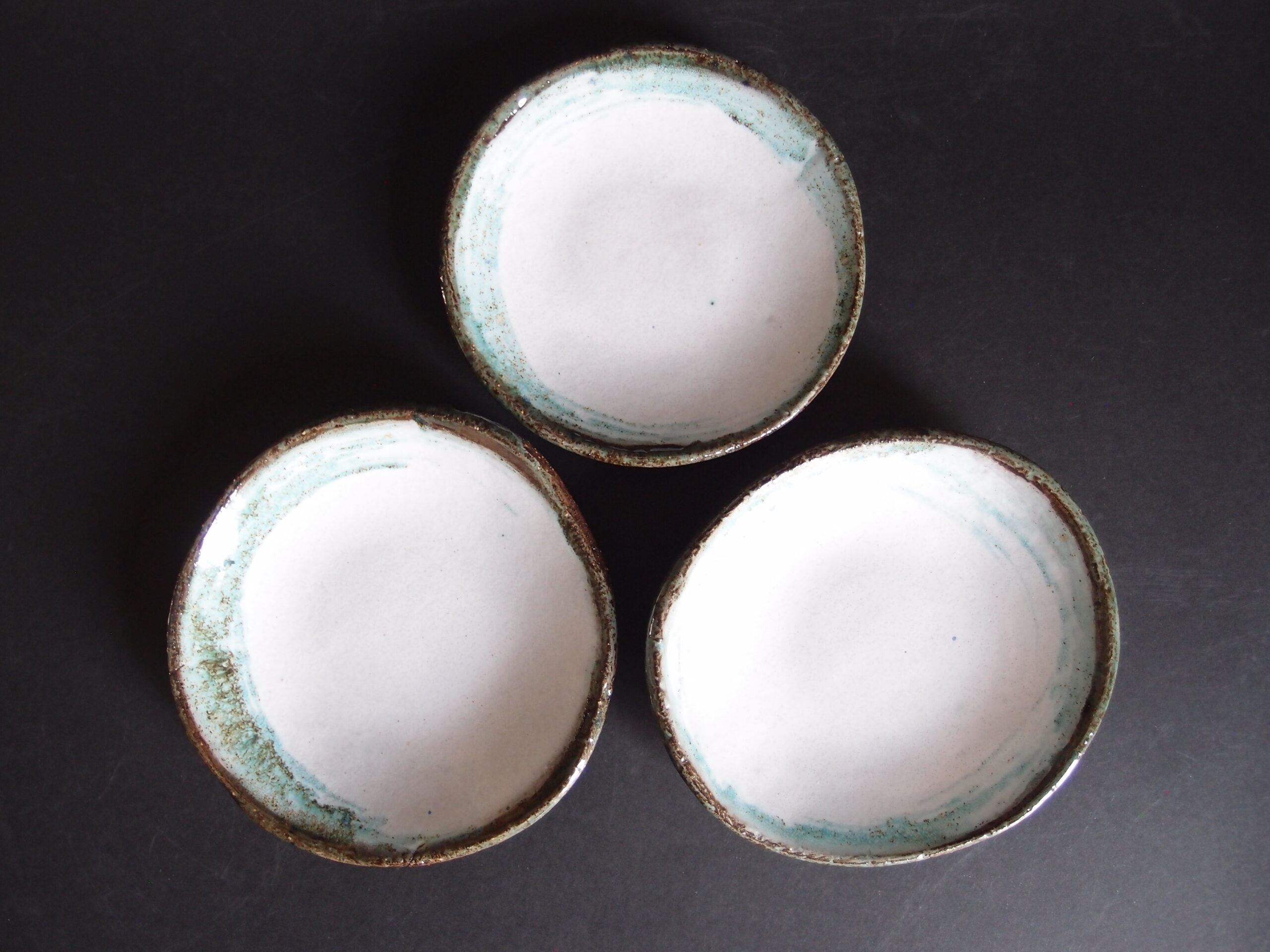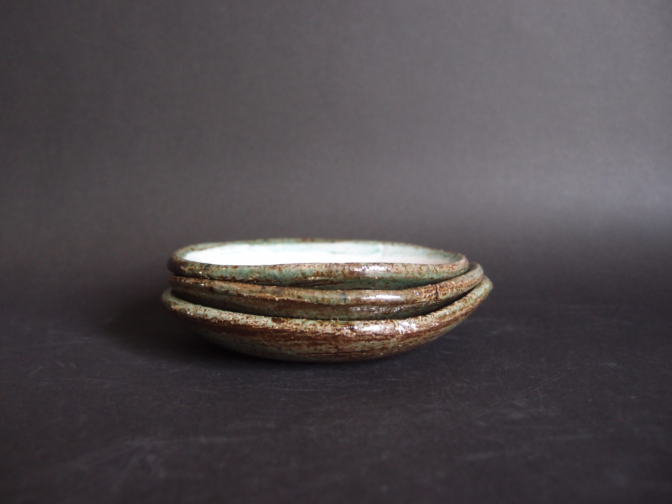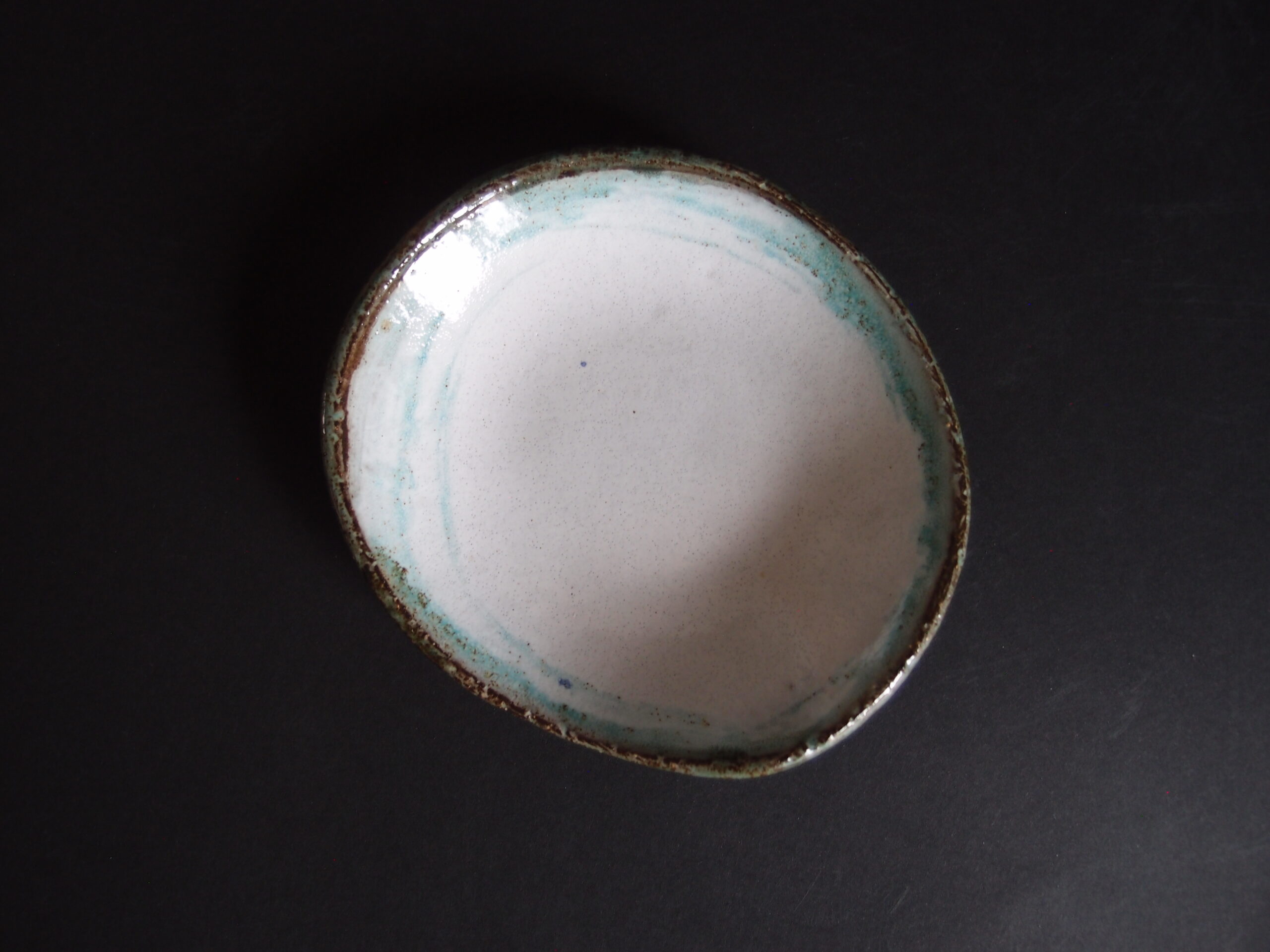 Miseczka wykonana z ciemnej gliny, pokryta białym, półmatowym szkliwem z błyszczącym, zielono-brązowym brzegiem.