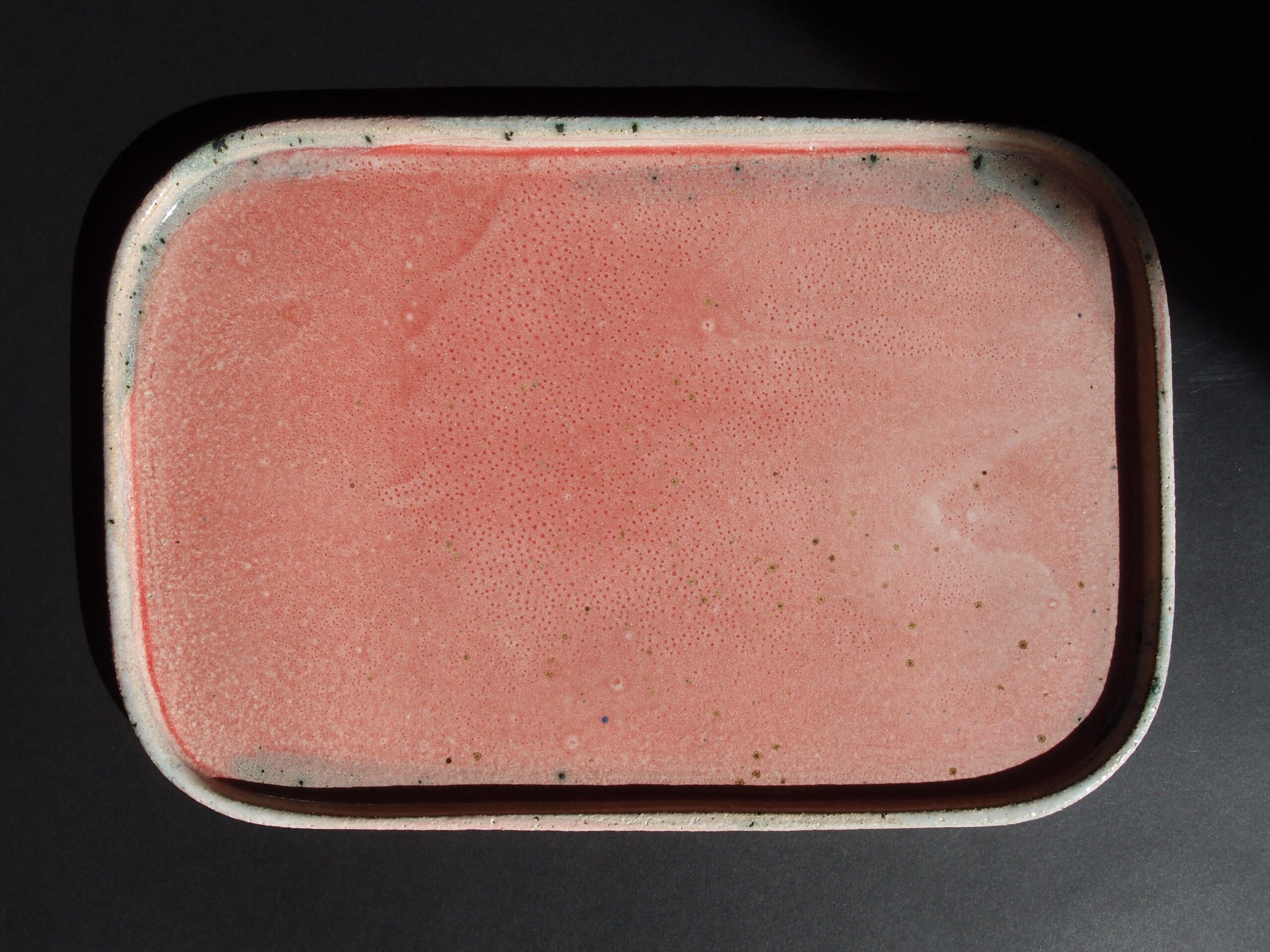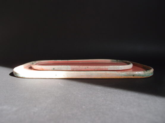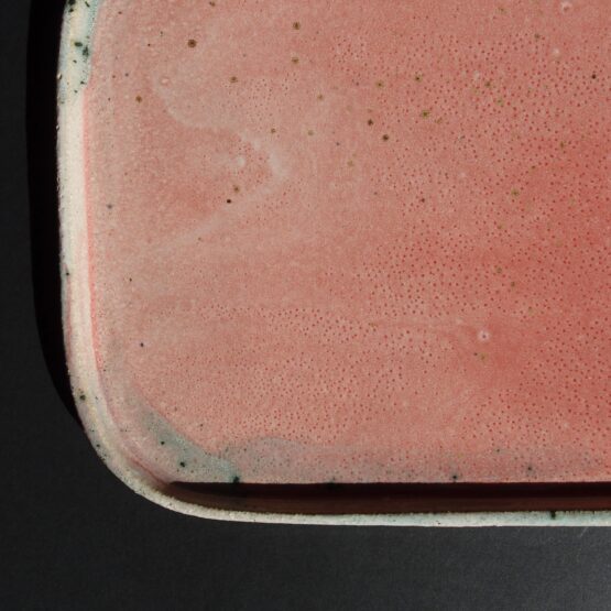 Patera wykonana z jasnej gliny, pokryta błyszczącym, różowym szkliwem z efektami i delikatnie turkusowym brzegiem.