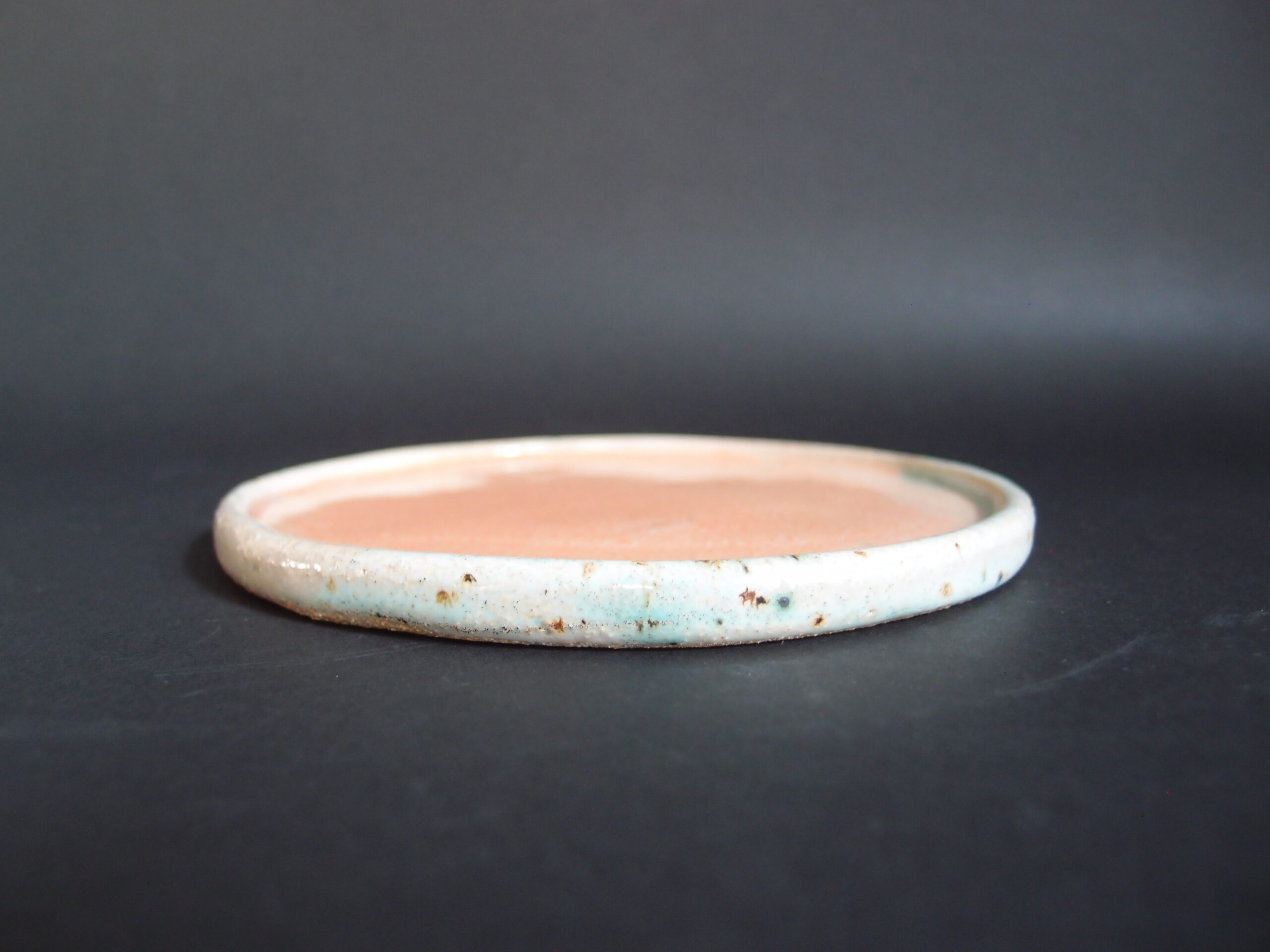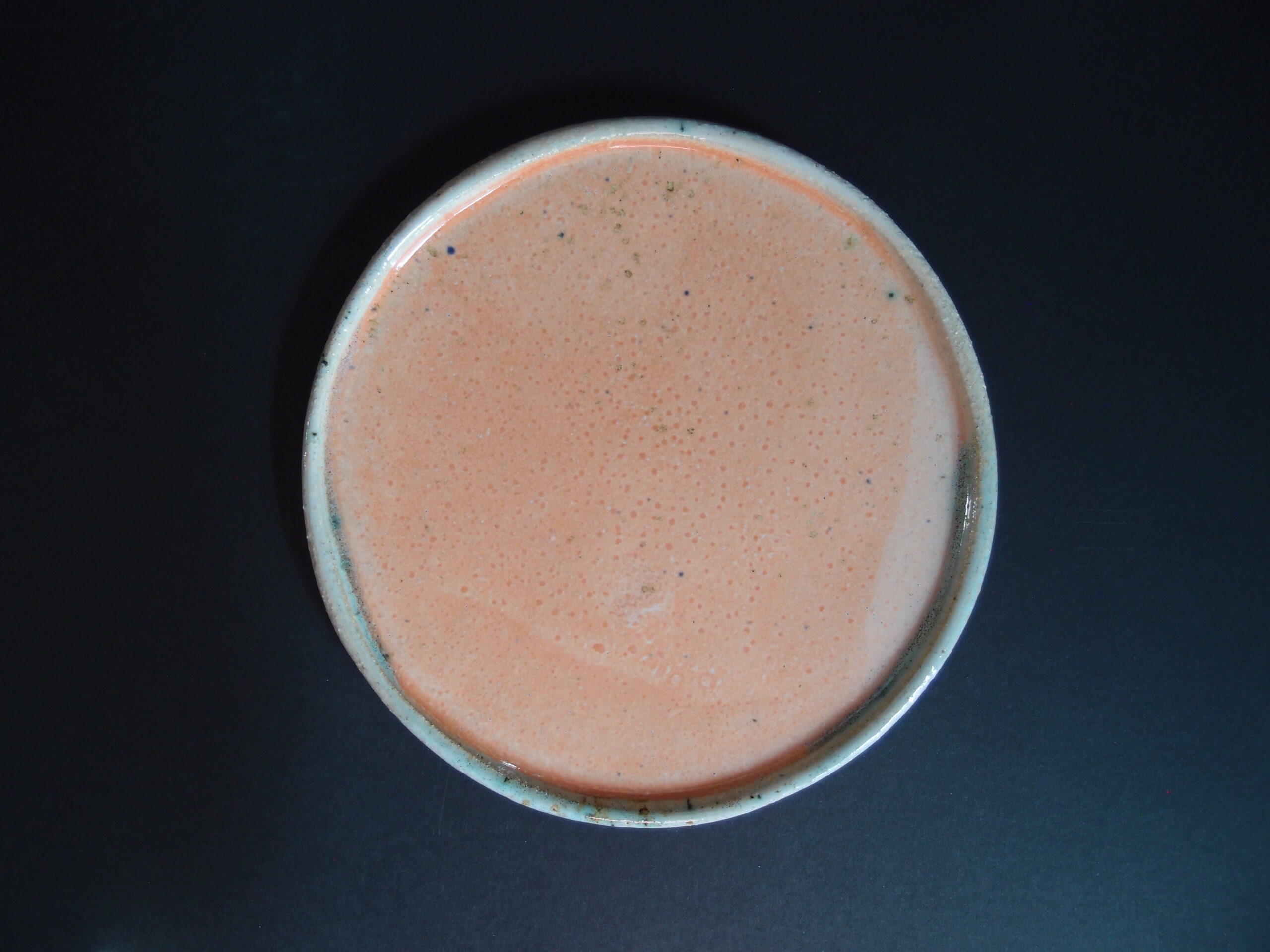 Talerz wykonany z jasnej gliny, pokryty jasnopomarańczowym, błyszczącym szkliwem z turkusowym brzegiem. Rozmiar talerza pasuje do podawania deserów, małych dań. Może stworzyć komplet z kolorową ceramiką.