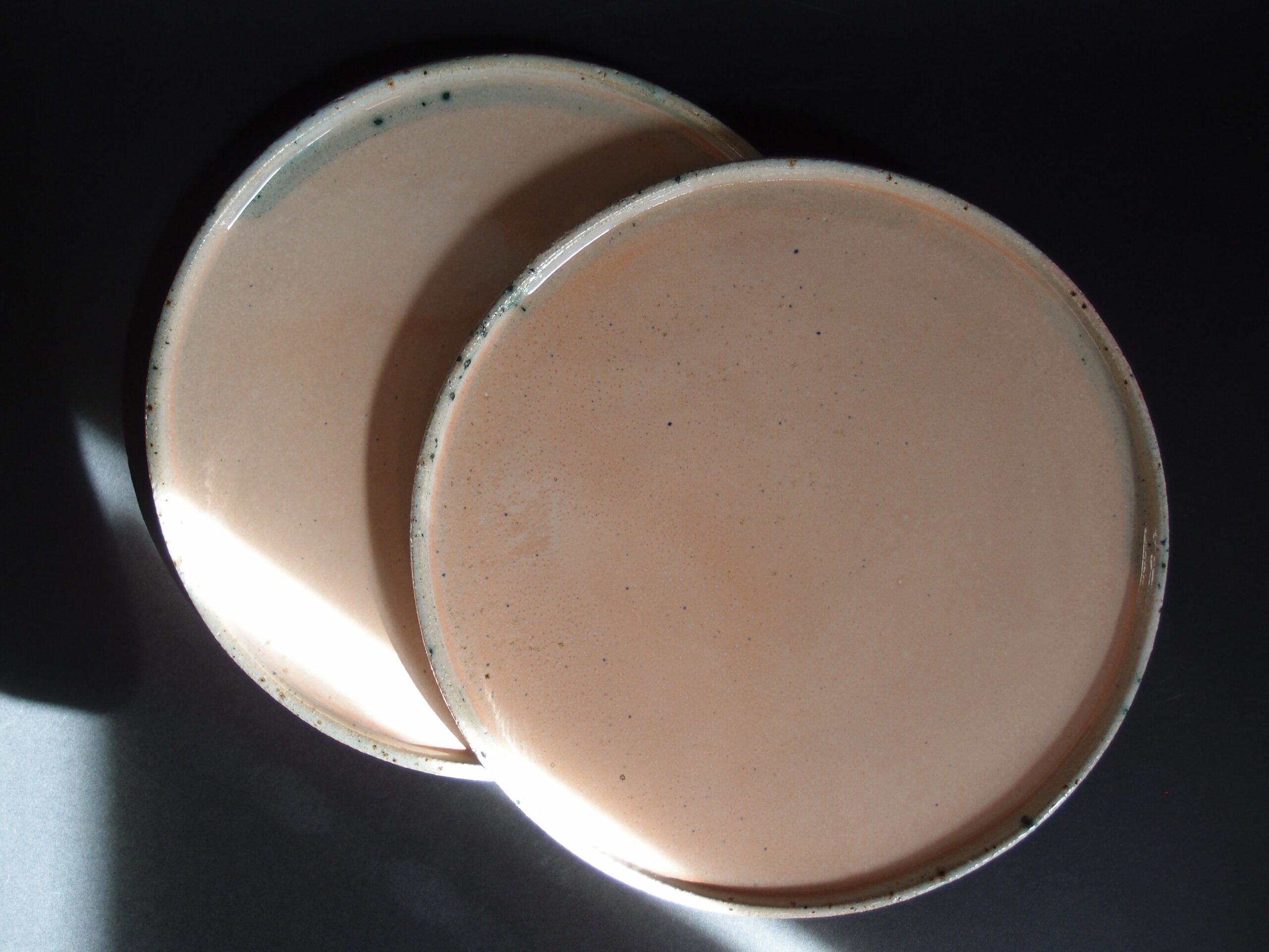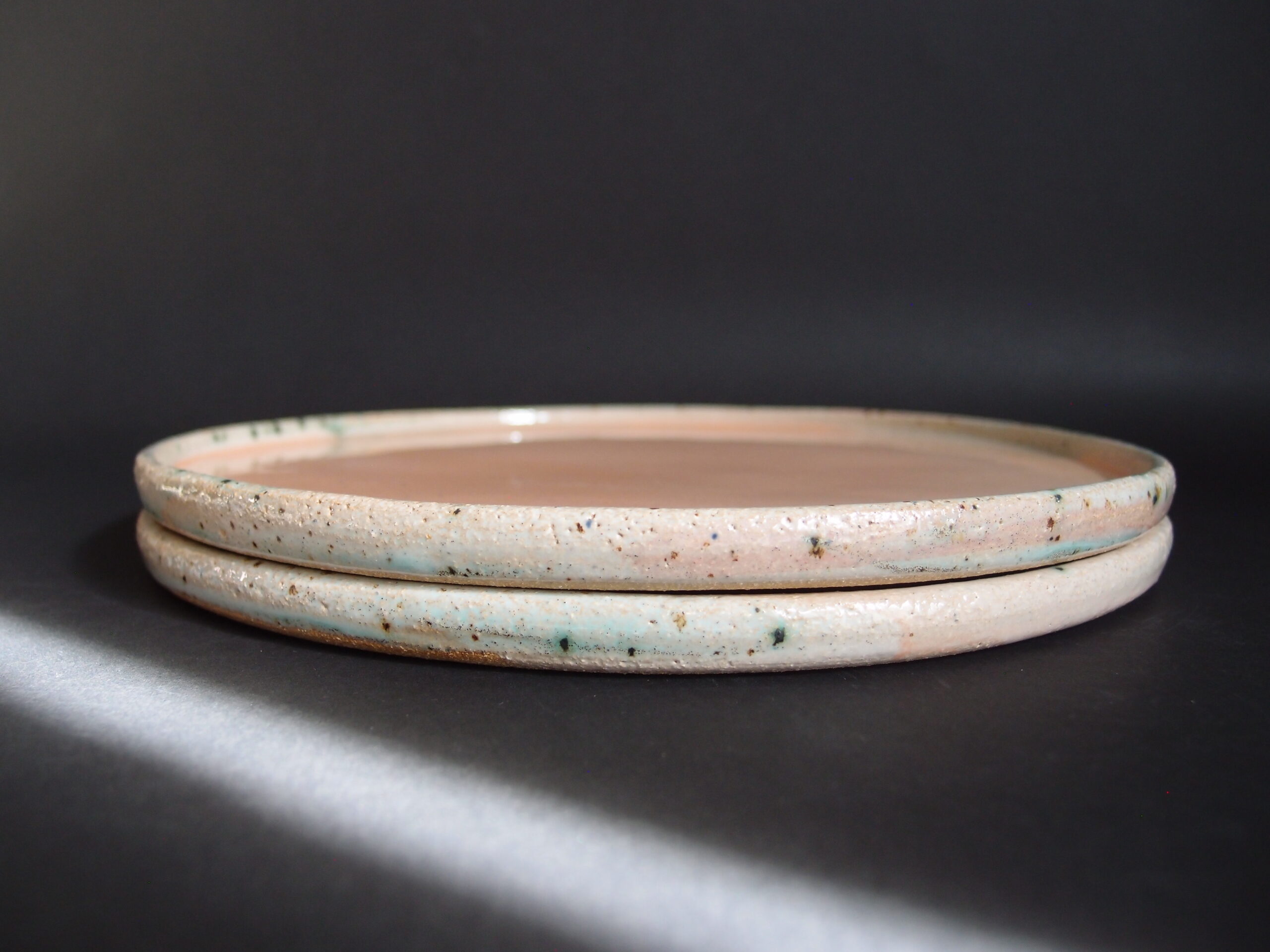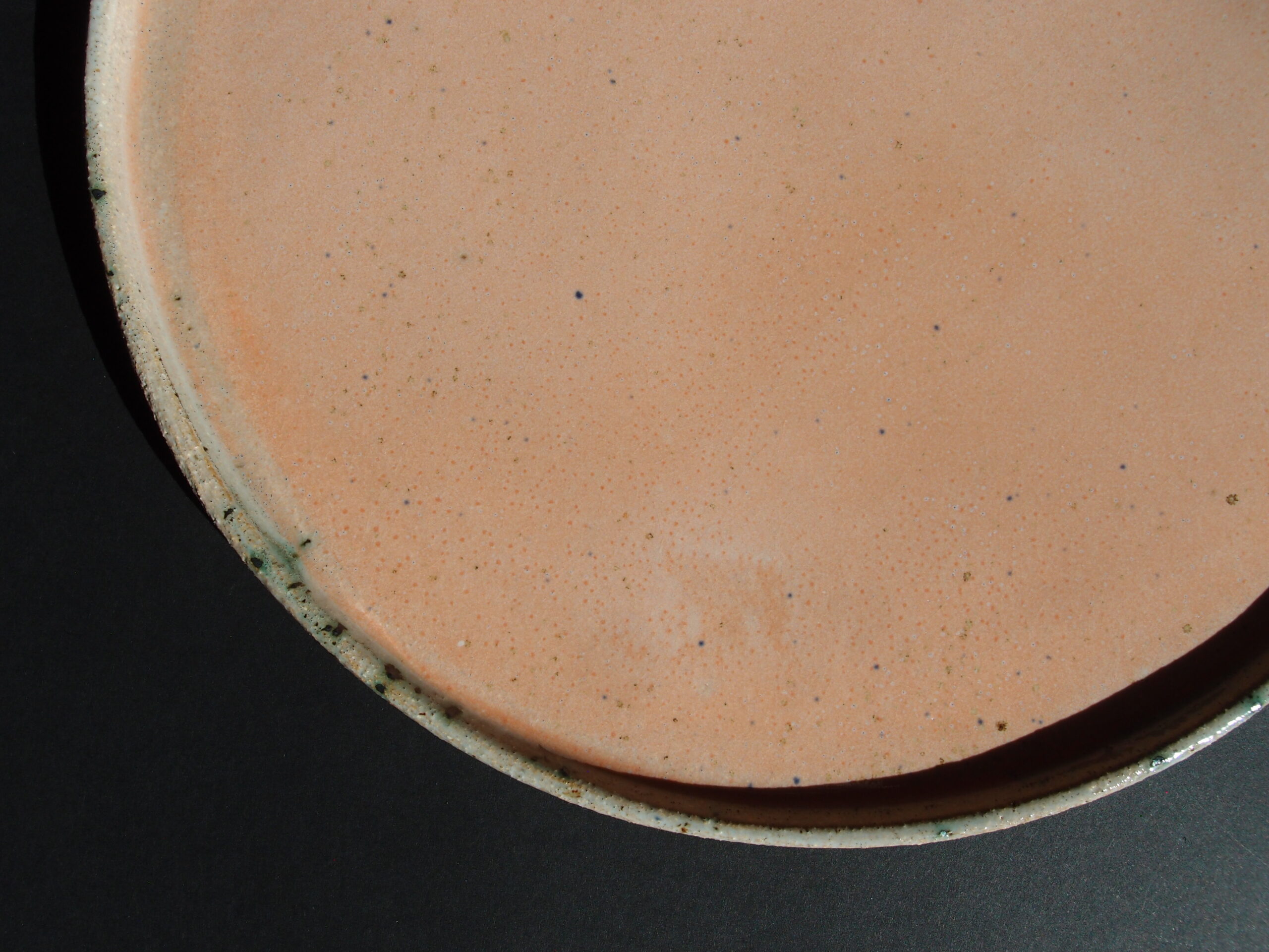 Talerz wykonany z jasnej gliny, pokryty jasnopomarańczowym, błyszczącym szkliwem z delikatnymi efektami i turkusowym przetarciem. Rozmiar talerza pasuje do podawania dań lub ciast. Może stworzyć komplet z deserowymi talerzami.
