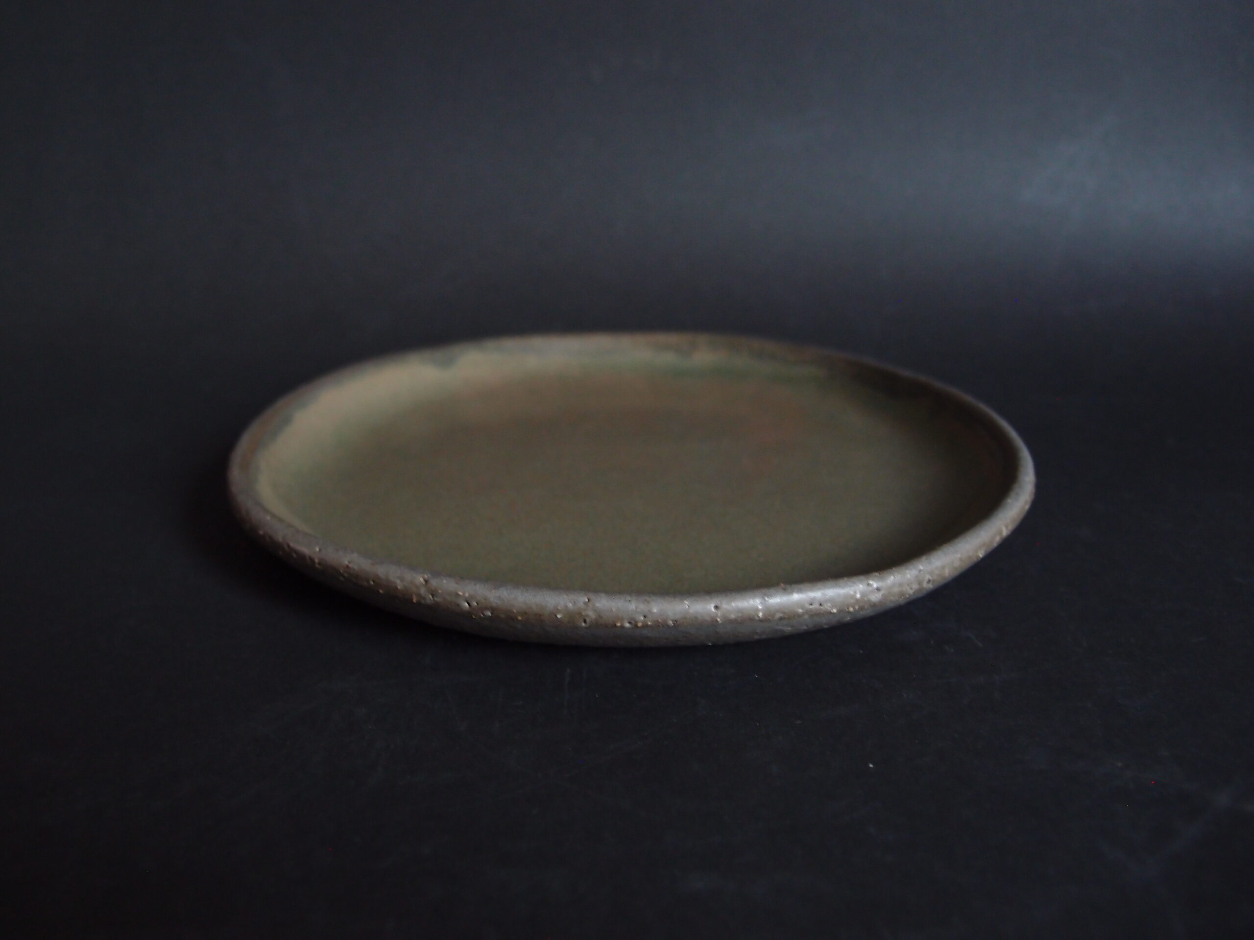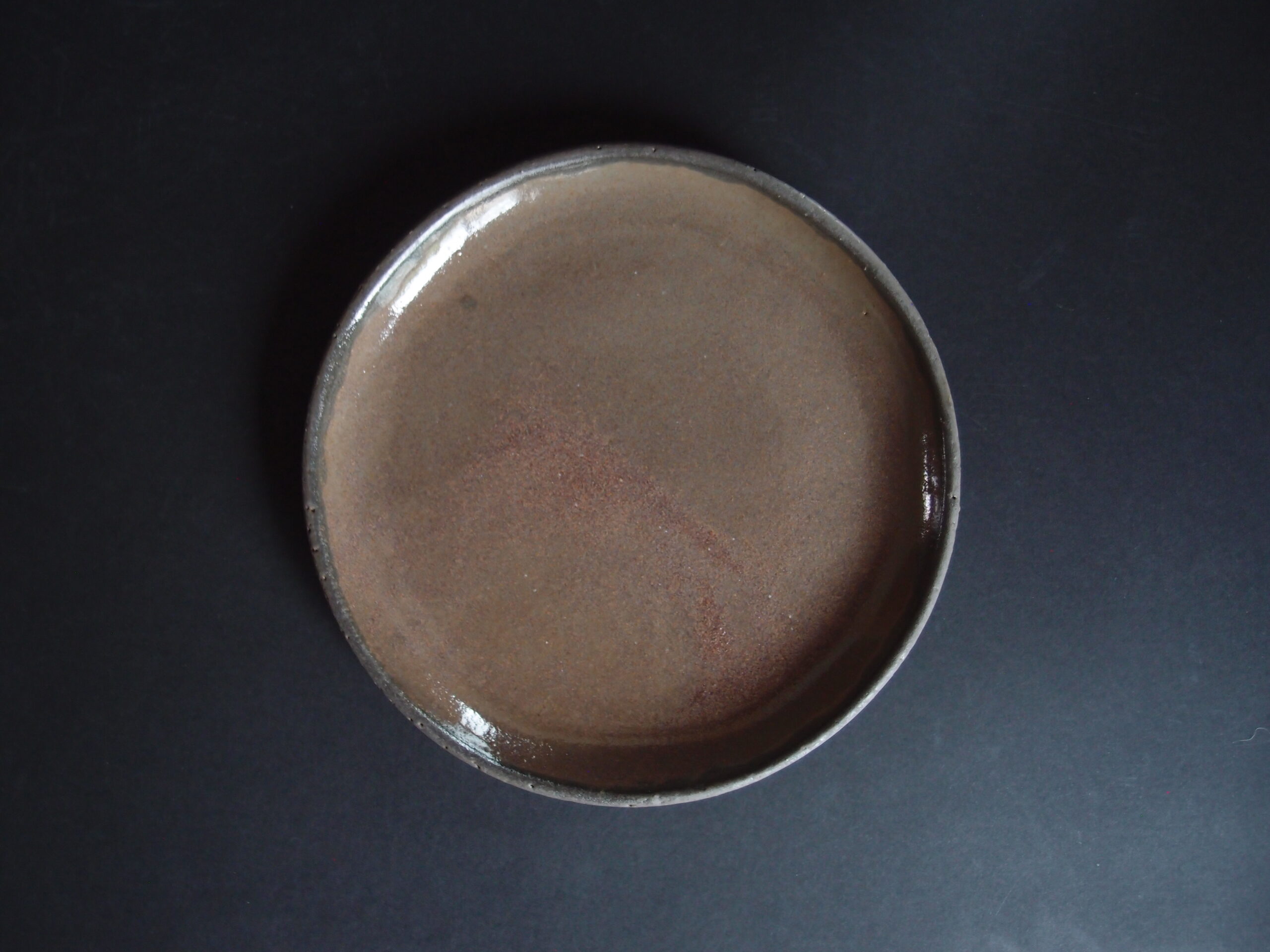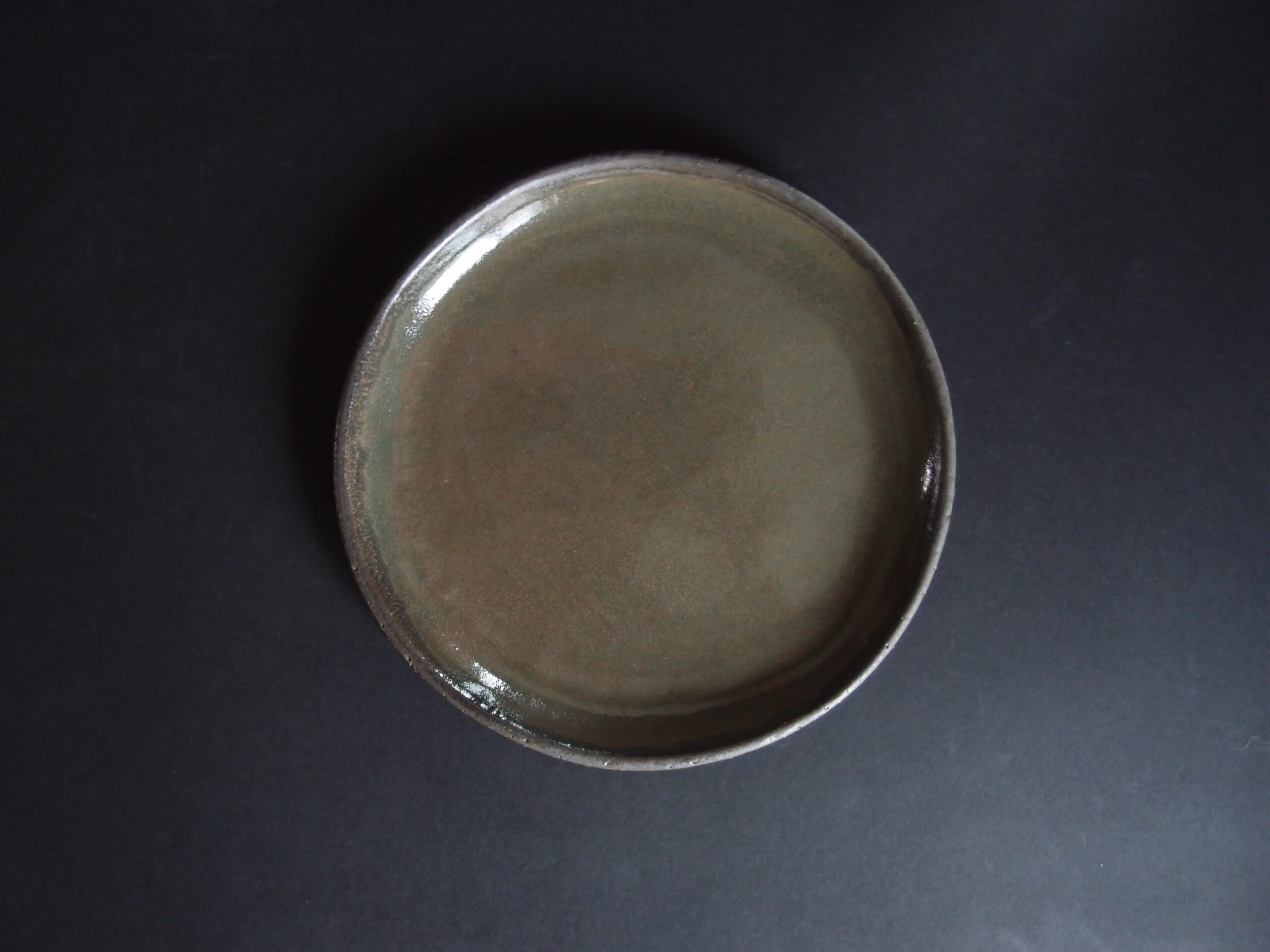 Talerz wykonany z ciemnej gliny, pokryty ciemnozielonym, błyszczącym szkliwem z efektami.