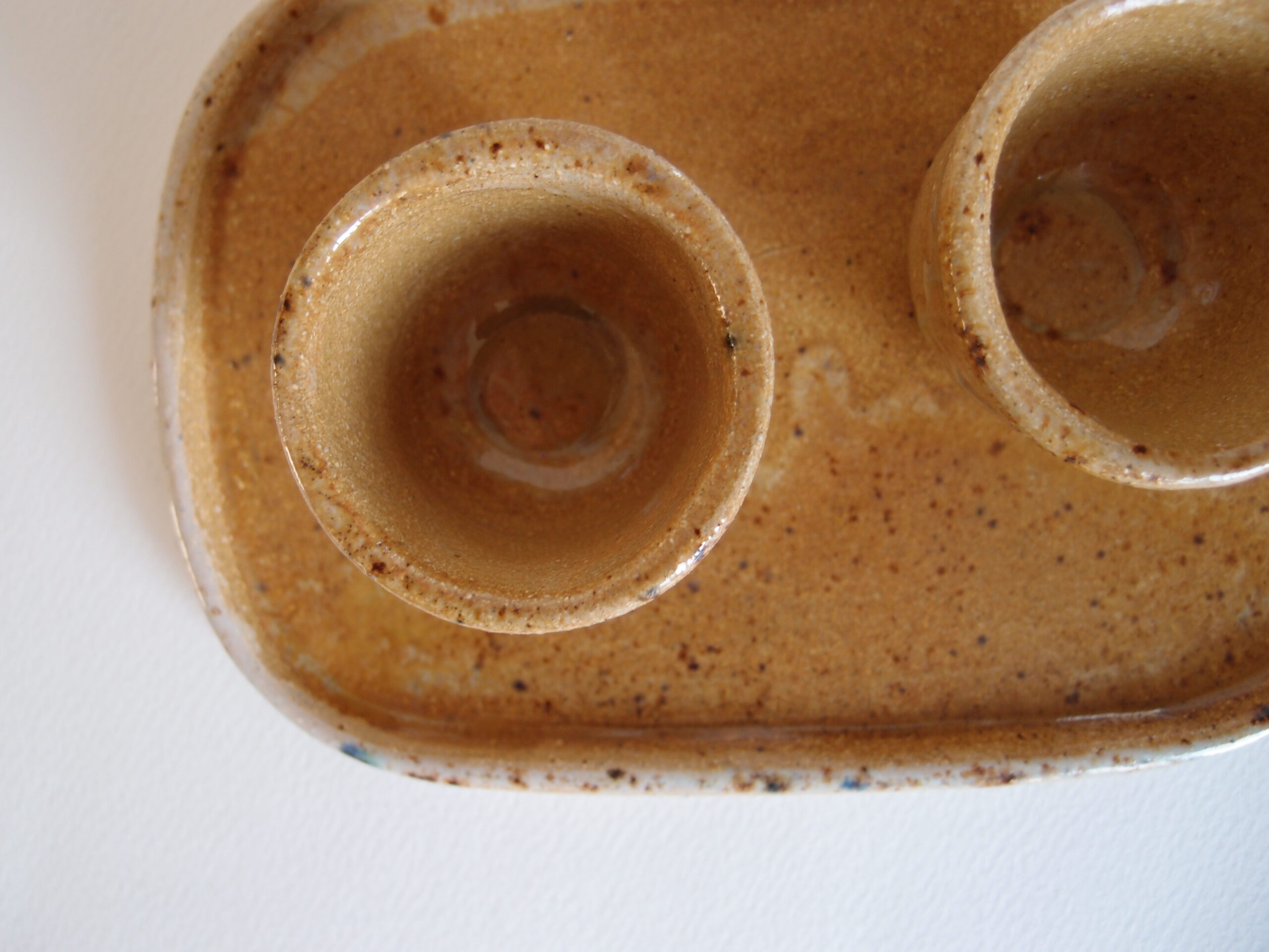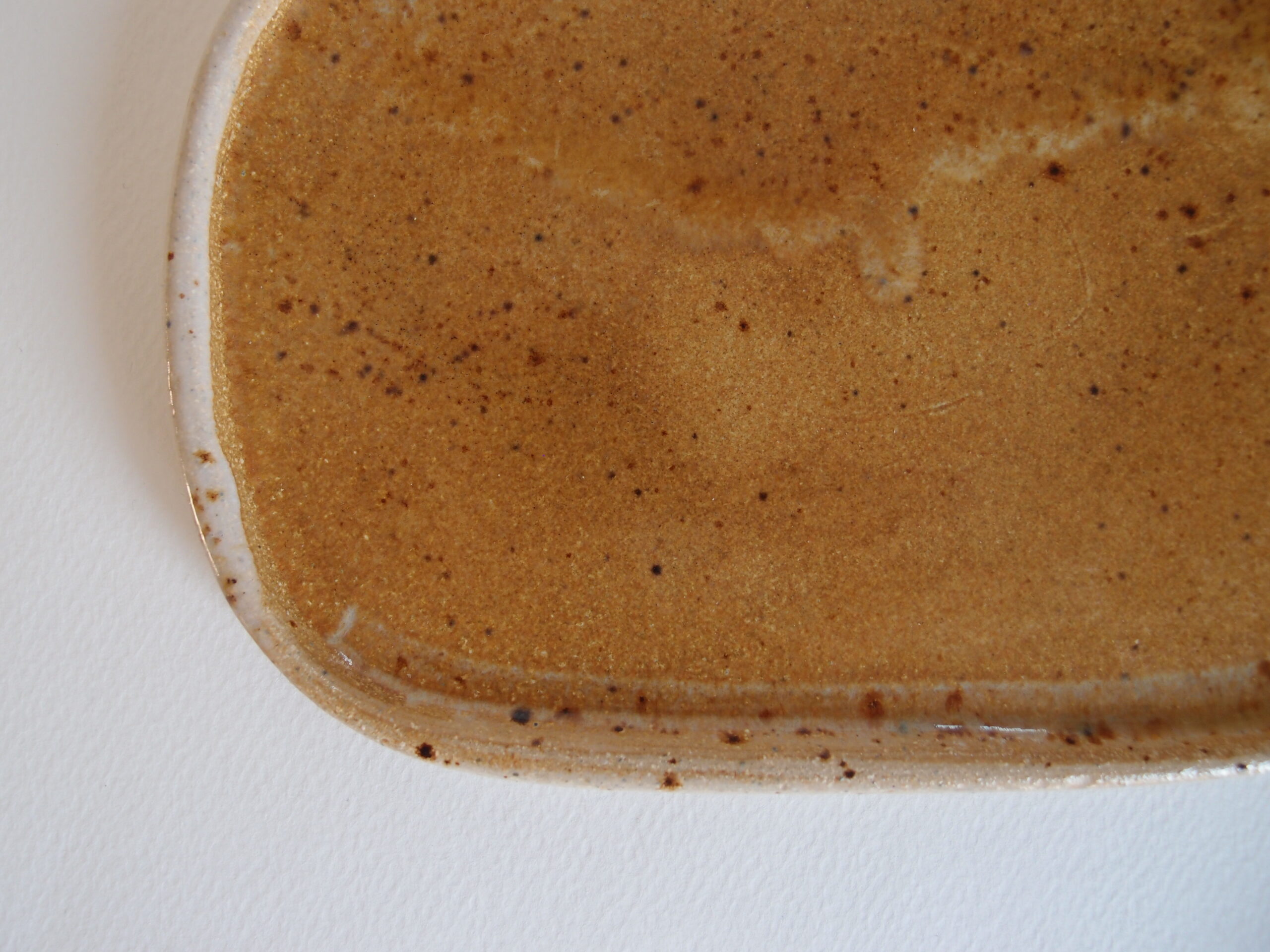 Talerz wykonany z jasnej gliny, pokryty pomarańczowym, półmatowym szkliwem z efektami nakrapiania i jaśniejszym brzegiem. Ten rozmiar talerza idealnie nadaję się do podawania ciastek, dodatków do dań lub jako podstawka.