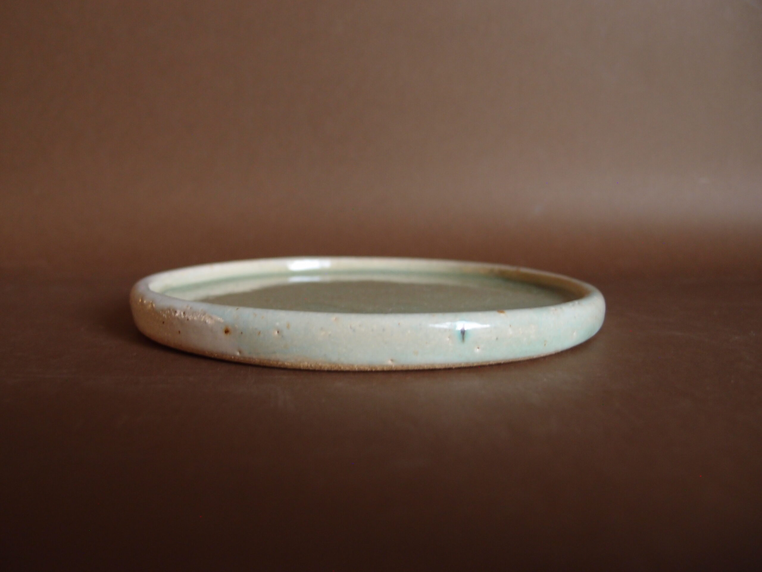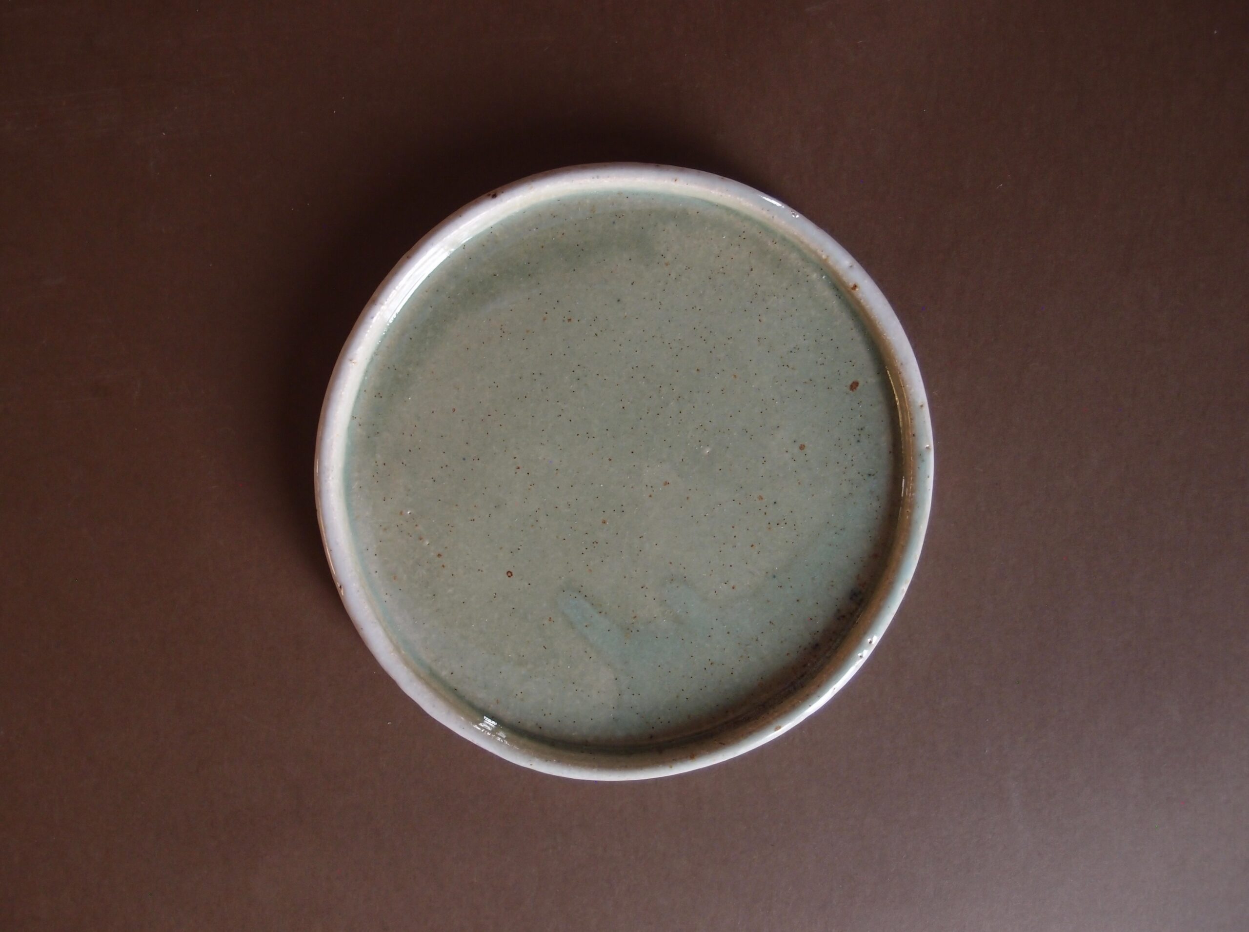 Talerz wykonany z jasnej gliny, pokryty jasnozielonym, błyszczącym szkliwem z białym brzegiem. Rozmiar talerza pasuje do podawania ciast, ciasteczek i małych kanapek. Może stworzyć komplet z kolorową ceramiką.