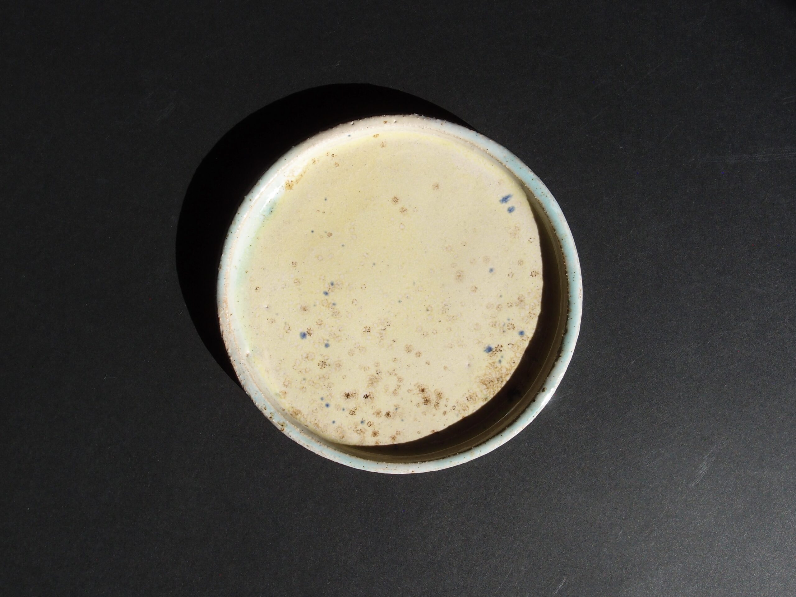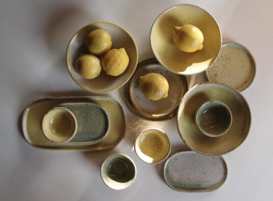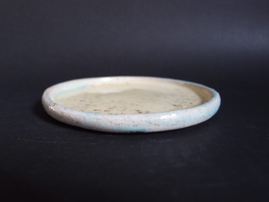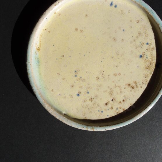 Talerzyk wykonany z jasnej gliny, pokryty żółtym, błyszczącym szkliwem z efektami nakrapiania i turkusowymi przetarciami. Może stworzyć zestaw deserowy z większymi talerzami lub być podstawką pod kubek, miseczkę.