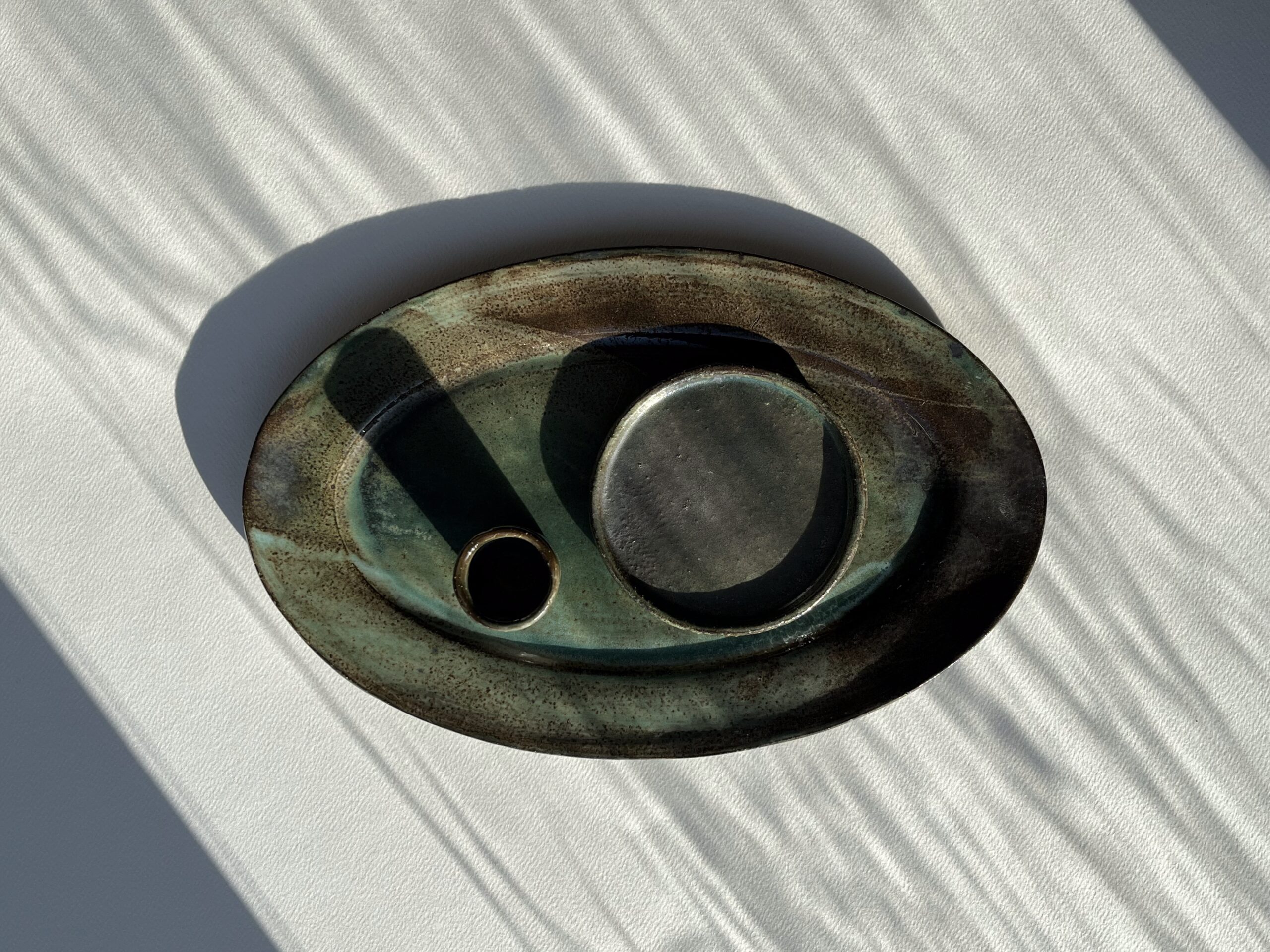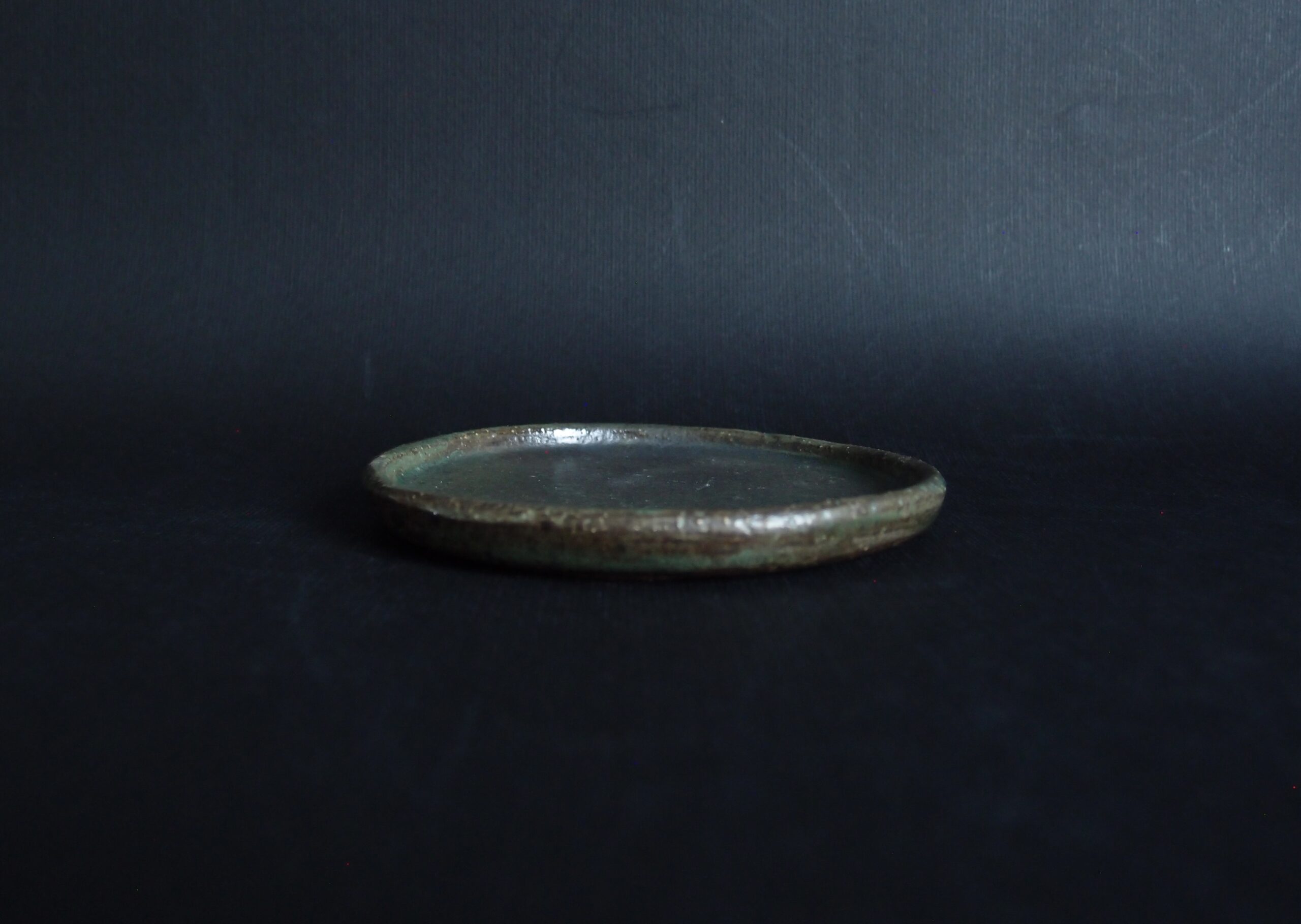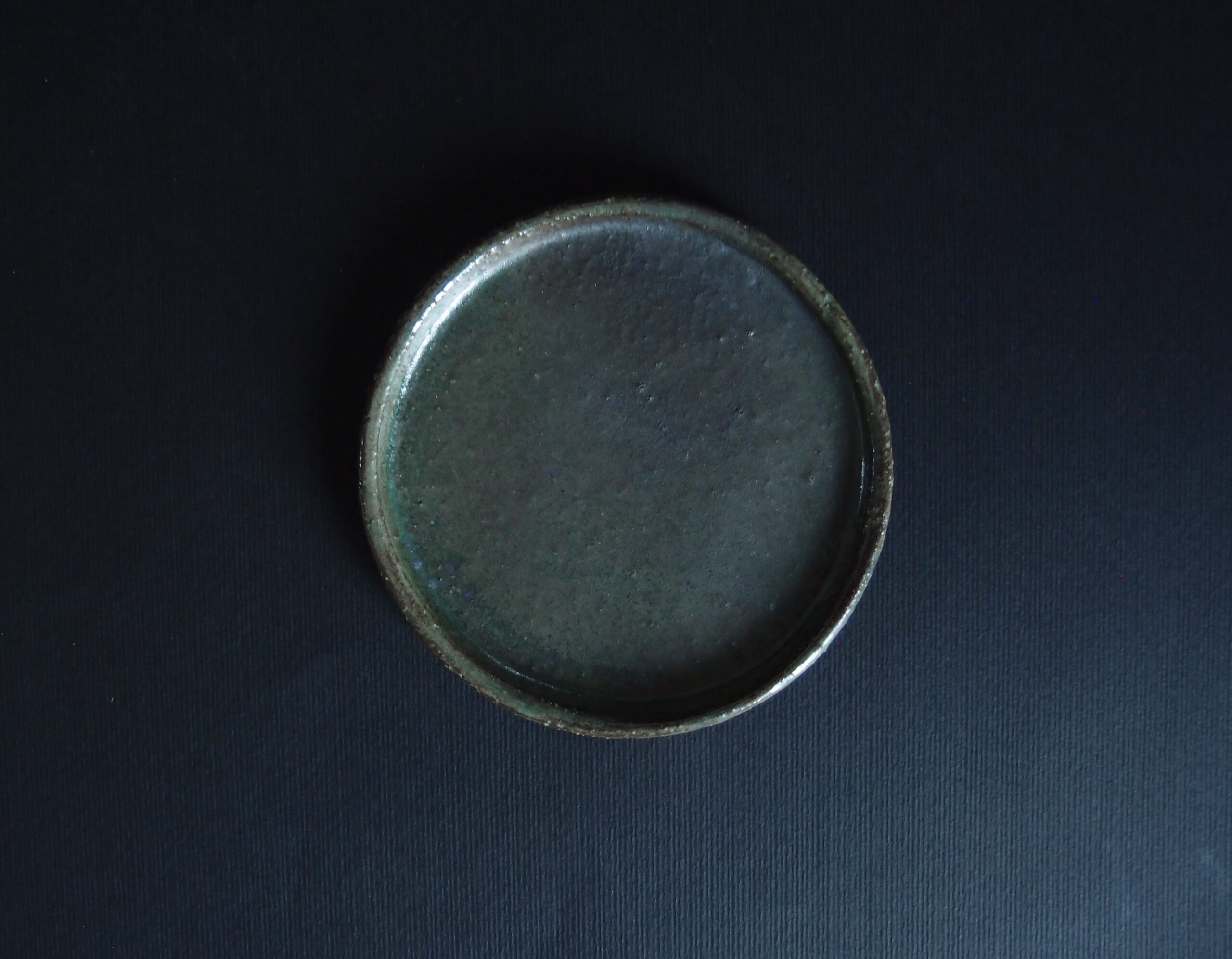 Talerz wykonany z ciemnej gliny, pokryty ciemnozielonym, matowym szkliwem z efektami. Może stworzyć zestaw deserowy z większymi talerzami lub być podstawką pod kubek, miseczkę.