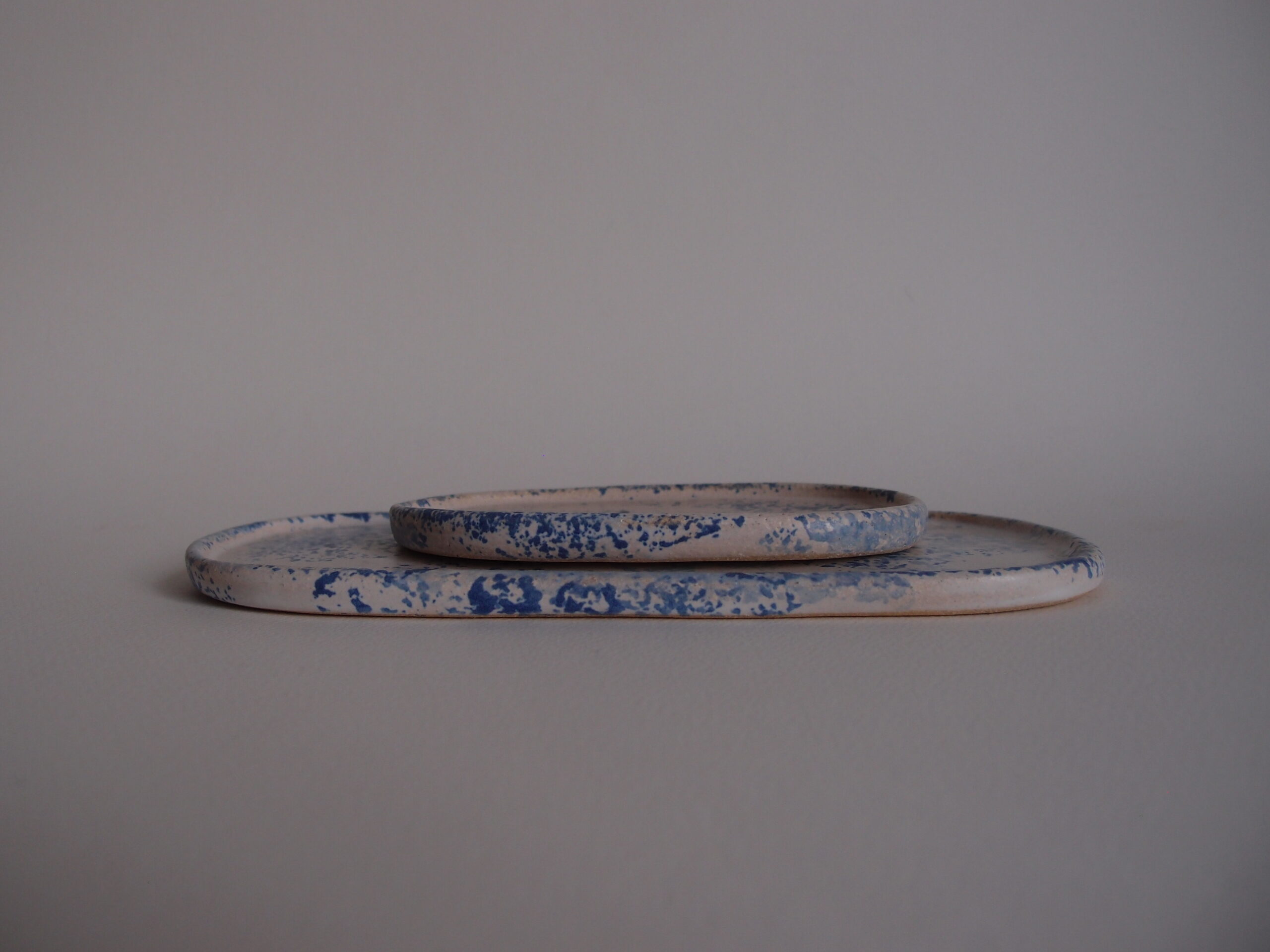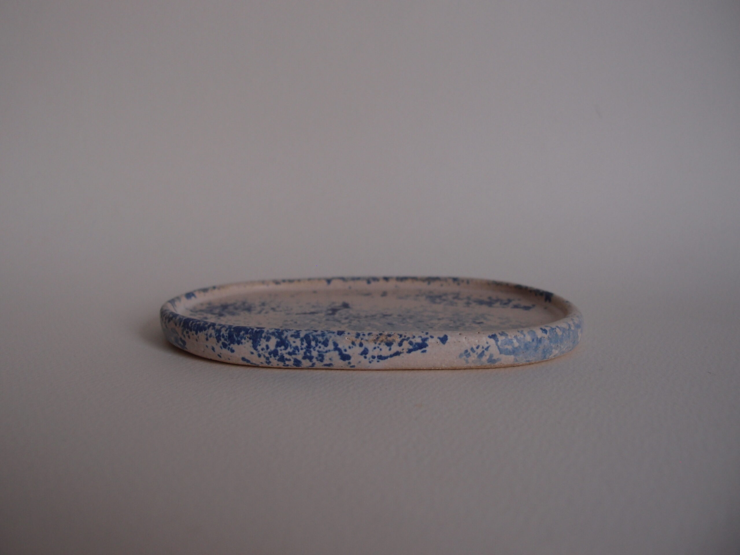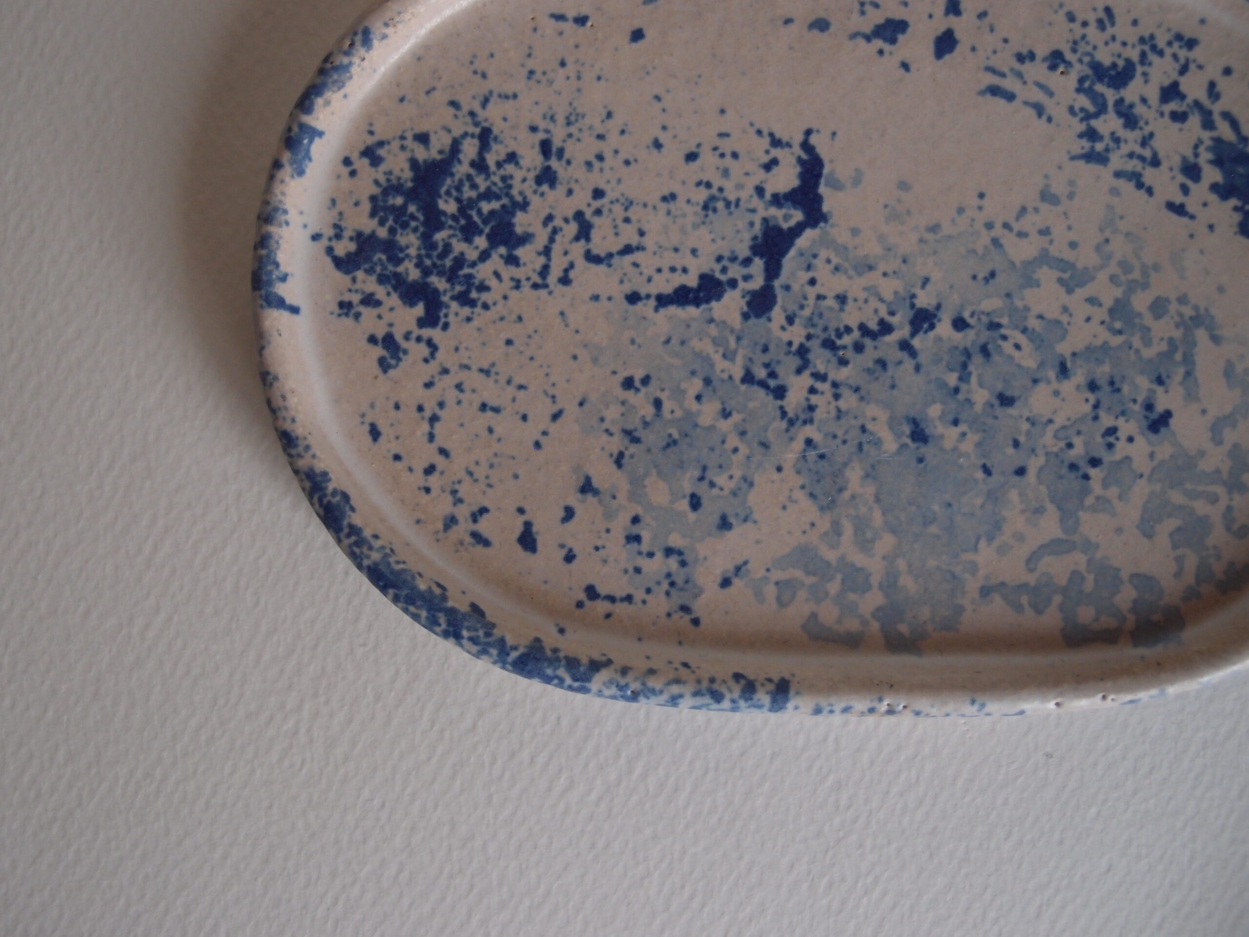 Wykonany z jasnej gliny, pokryty białym, matowym szkliwem z niebieskimi efektami.